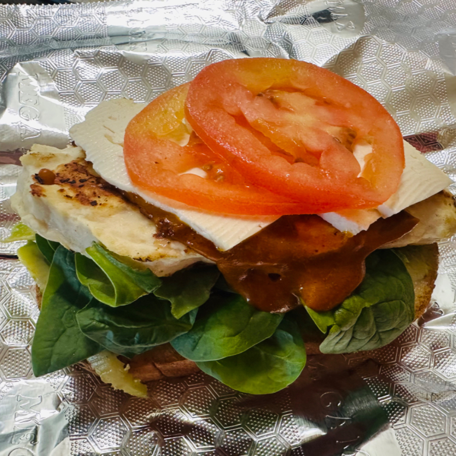 Sándwich con pechuga de pollo a la plancha, aguacate, espinaca, queso panela, tomate y salsa Bbq.