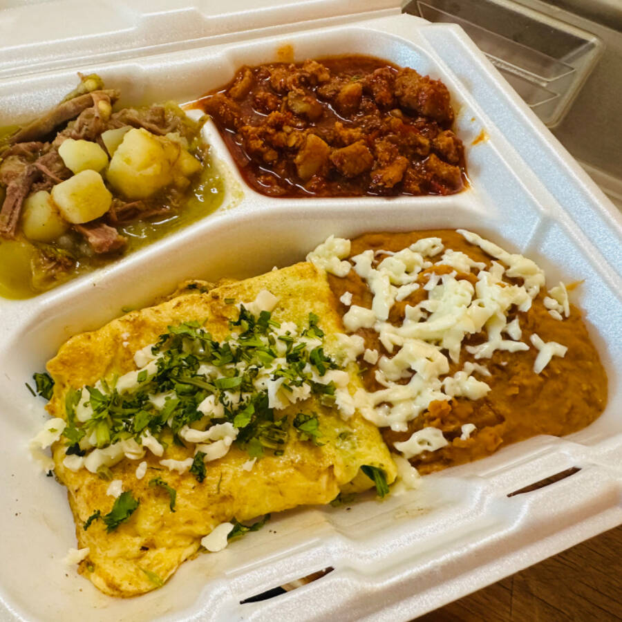 Omelette con queso y un ingrediente, acompañado de frijoles con queso y dos guarniciones a elegir.