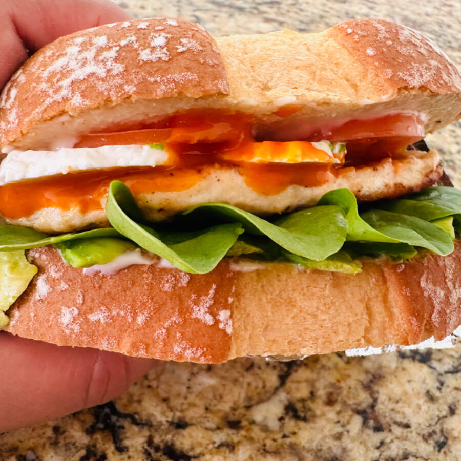 Sándwich con pechuga de pollo a la plancha, aguacate, espinaca, queso panela, tomate y salsa búfalo.
