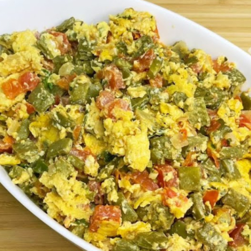 Huevos revueltos con deliciosos nopalitos sazonados, acompañados de frijoles refritos con queso y tortillas de maiz