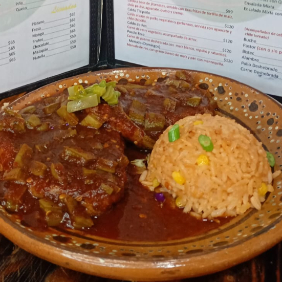 3 tortitas de camaron en salsa roja con nopalitos. Acompañadas de arroz rojo