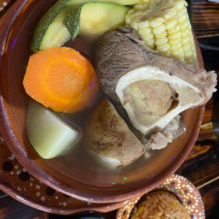 1 Litro de caldo de chamberete de res y vegetales, acompañado de arroz rojo(personal), 4 tortillas de maiz, trozo maiz y salsa. Plato personal