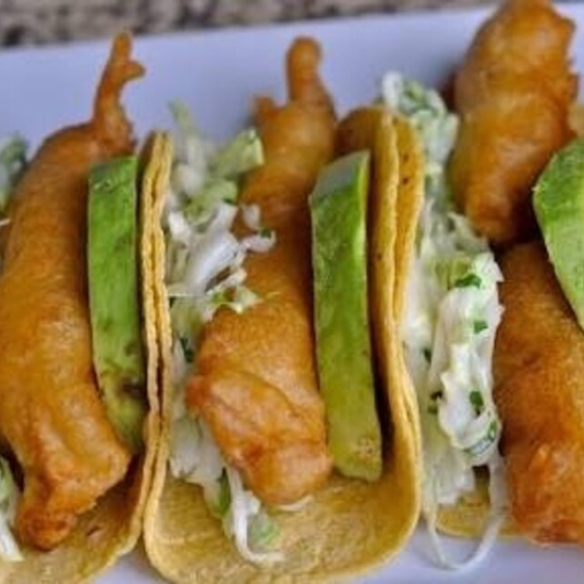 3 tacos de pescado capeado estilo sinaloa, acompañados de ensalada fresca