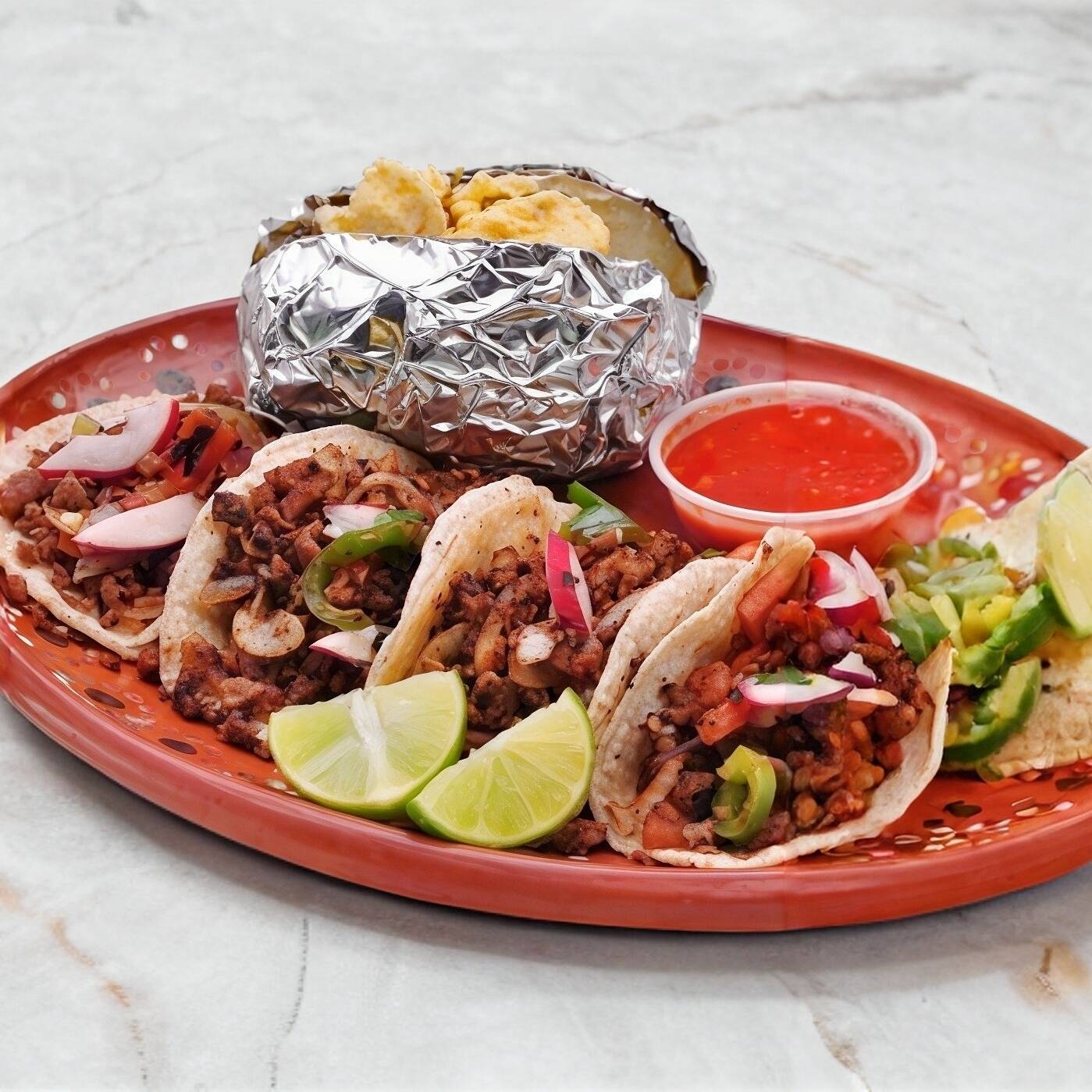 4 Tacos acompañado de Papa asada y salsas