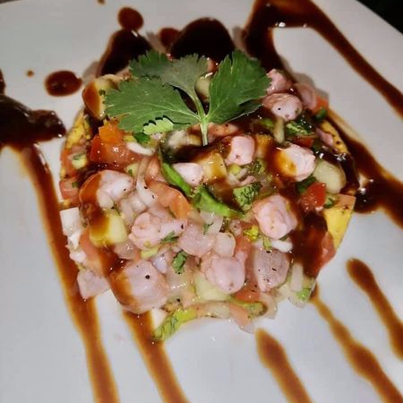 Ceviche estilo Cancún con camarón cocido, Tostitos y una cama de aguacate.