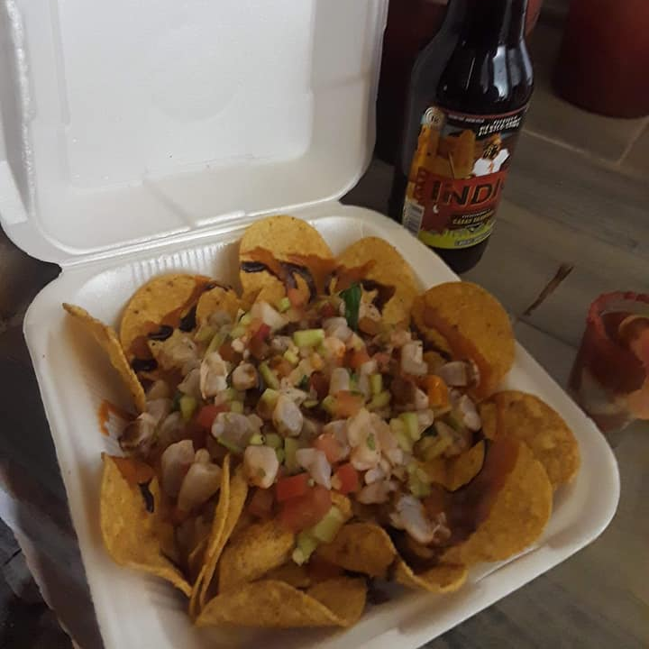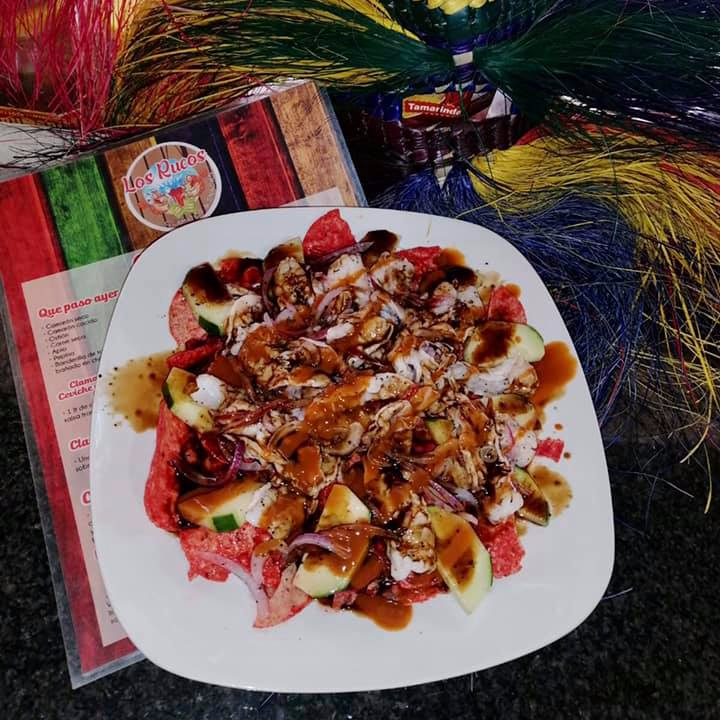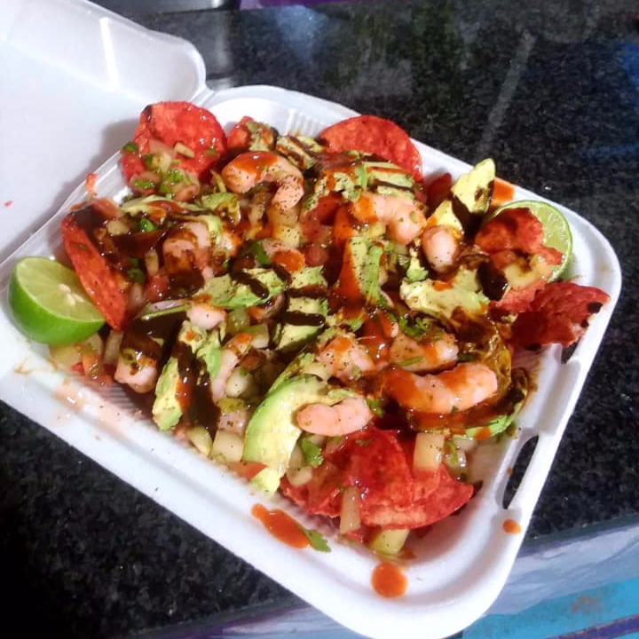 Tostitos, ceviche, cacahuates, gomitas de víbora, panditas, churritos, gomitas enchiladas y banderillas de chamoy bañados en salsa marisquera.