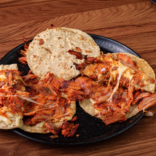 Tres quesadillas de maíz con pastor bajado del trompo, incluye cebolla, cilantro, salsa de la casa y limón