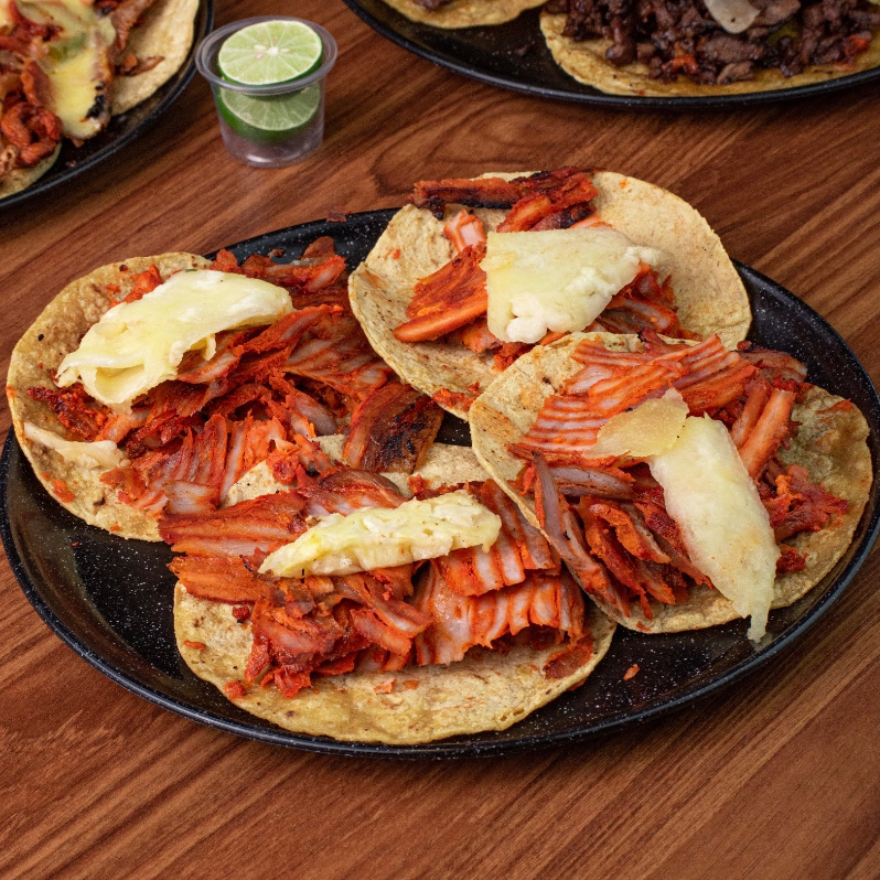 Orden de 4 tacos en tortilla de maíz con carne de pastor con queso, con cebolla, cilantro, salsa de la casa y limón.