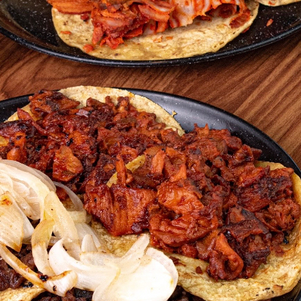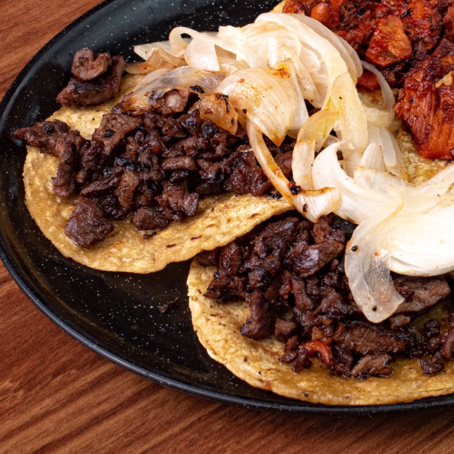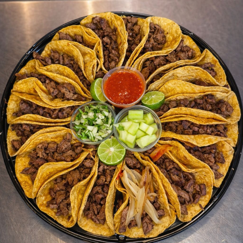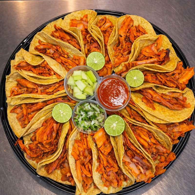 Incluye tortillas, cebolla, cilantro, limón, y salsas de la casa.