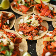 Orden de 2 tacos en tortilla de maíz con carne de pastor, con cebolla, cilantro, salsa de la casa y limón.