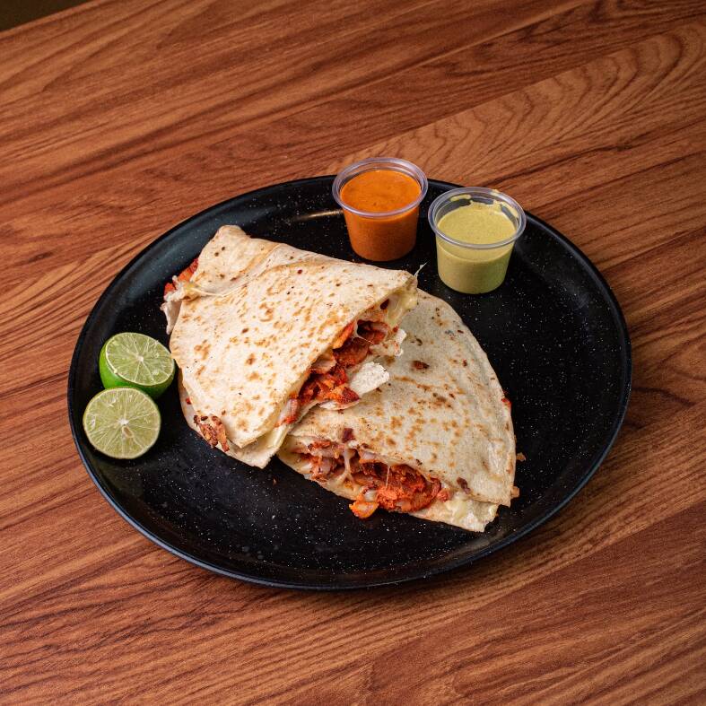 Quesadilla en tortilla de harina con carne de pastor, incluye cebolla, cilantro, salsa de la casa y limón