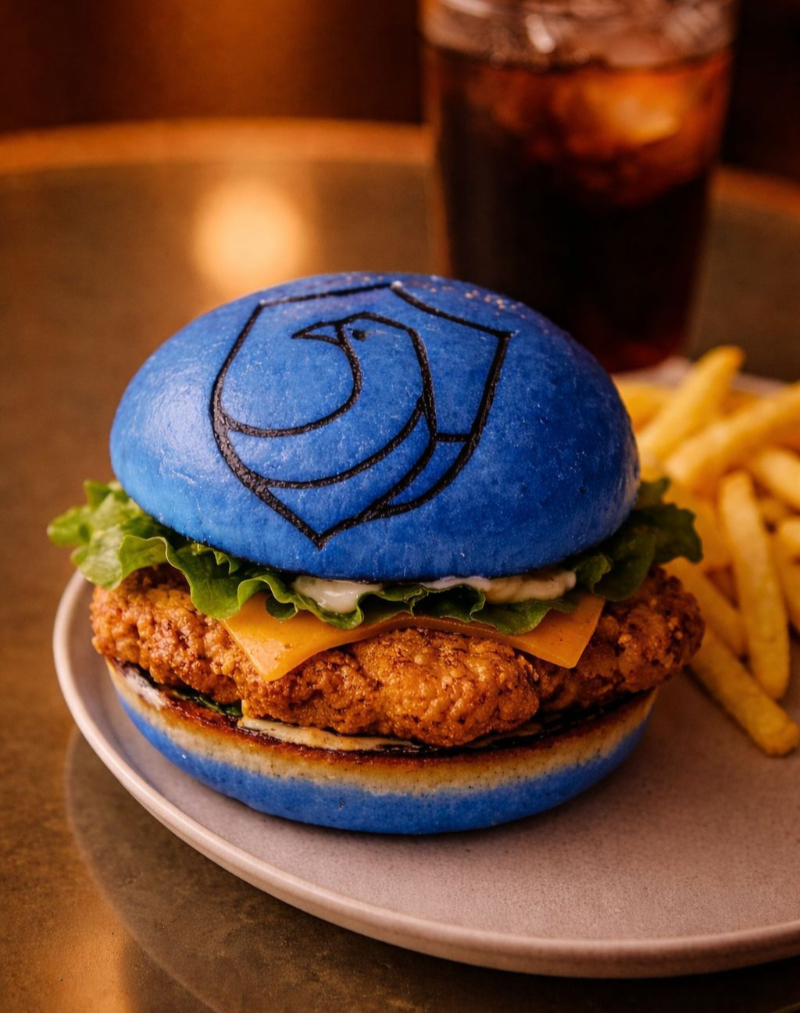 Hamburguesa en pan azul con pechuga de pollo empanizada bañada en salsa dulce picante, lechuga, cebolla, tomate, pepinillos y ensalada de repollo. Incluye papas fritas.