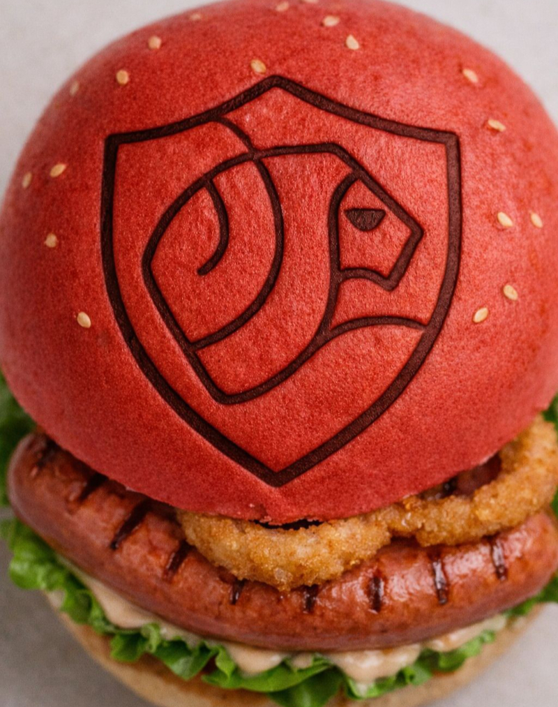 Hamburguesa en pan rojo con carne, salchicha polaca, aros de cebolla, mermelada de frutos rojos con chipotle, lechuga, tomate, cebolla y pepinillos. Incluye papas fritas.
