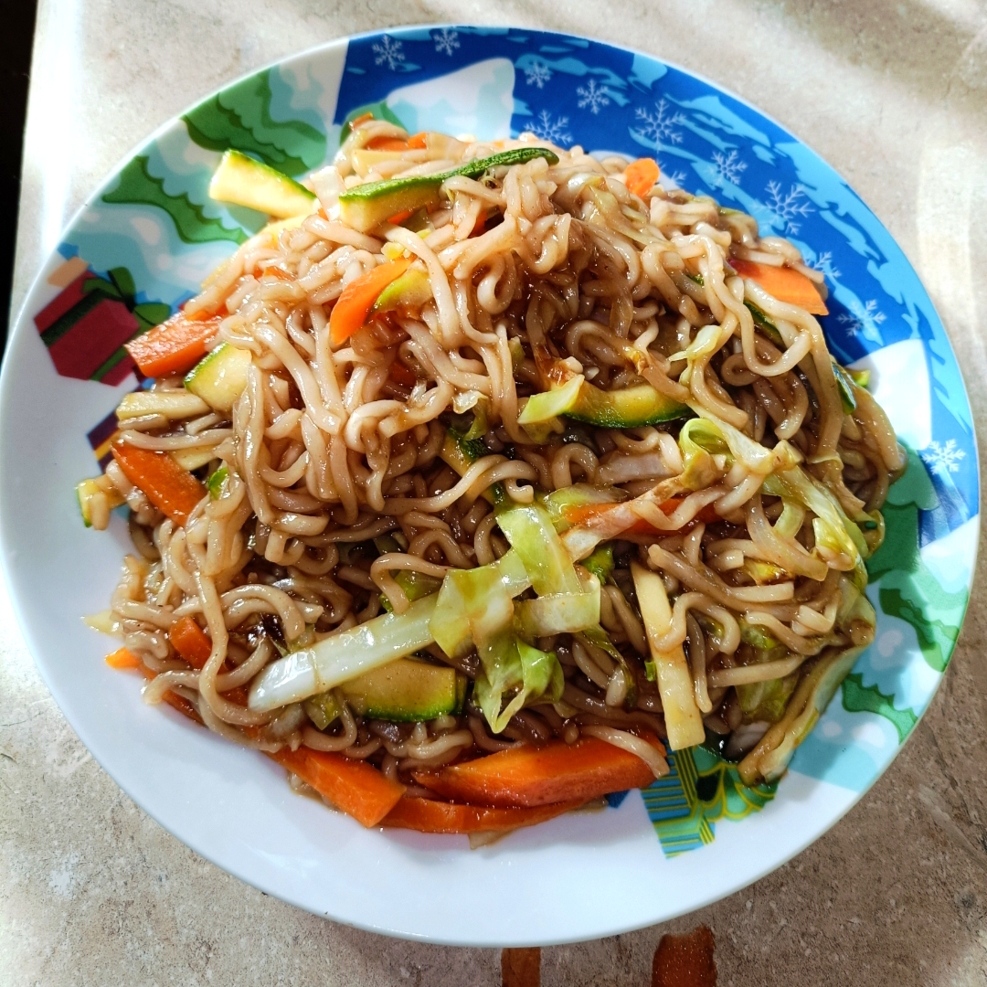 Fideos salteados, con verduras (zanahoria, calabaza y repollo)