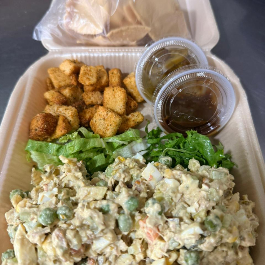 Deliciosa ensalada de la casa que lleva atún, manzana, nuez, apio, vegetales, huevo cocido y aderezos sobre una cama de lechuga acompañada de totopos y crutones.