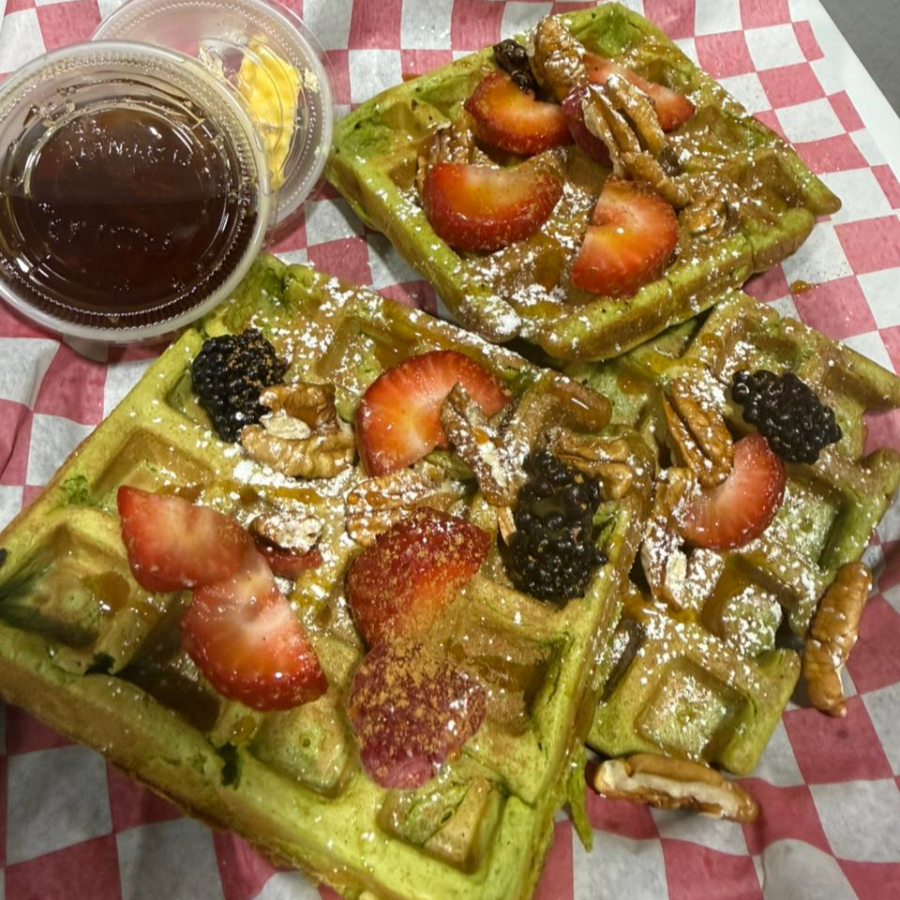 3 Piezas de Waffle Espinaca+banana, con platano, moras, cubiertos de azucar glass y canela. Con mantequilla y miel al gusto.