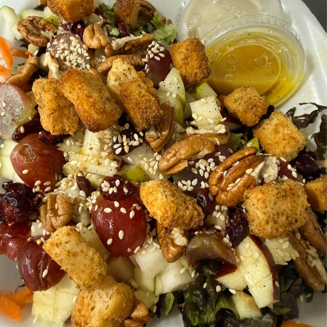 Fruta de temporada, lechugas, arandanos, nuez, zanahoria rallada, tomate, ajonjoli, crutones y aceite de oliva extravirgen.