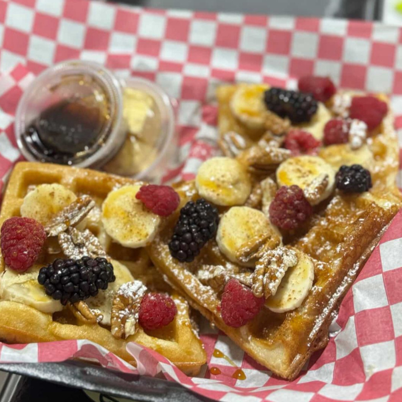 3 Piezas de Waffle de mantequilla de manny con platano, moras, con un toque de azucar glass y canela. Con mantequilla y miel al gusto.
