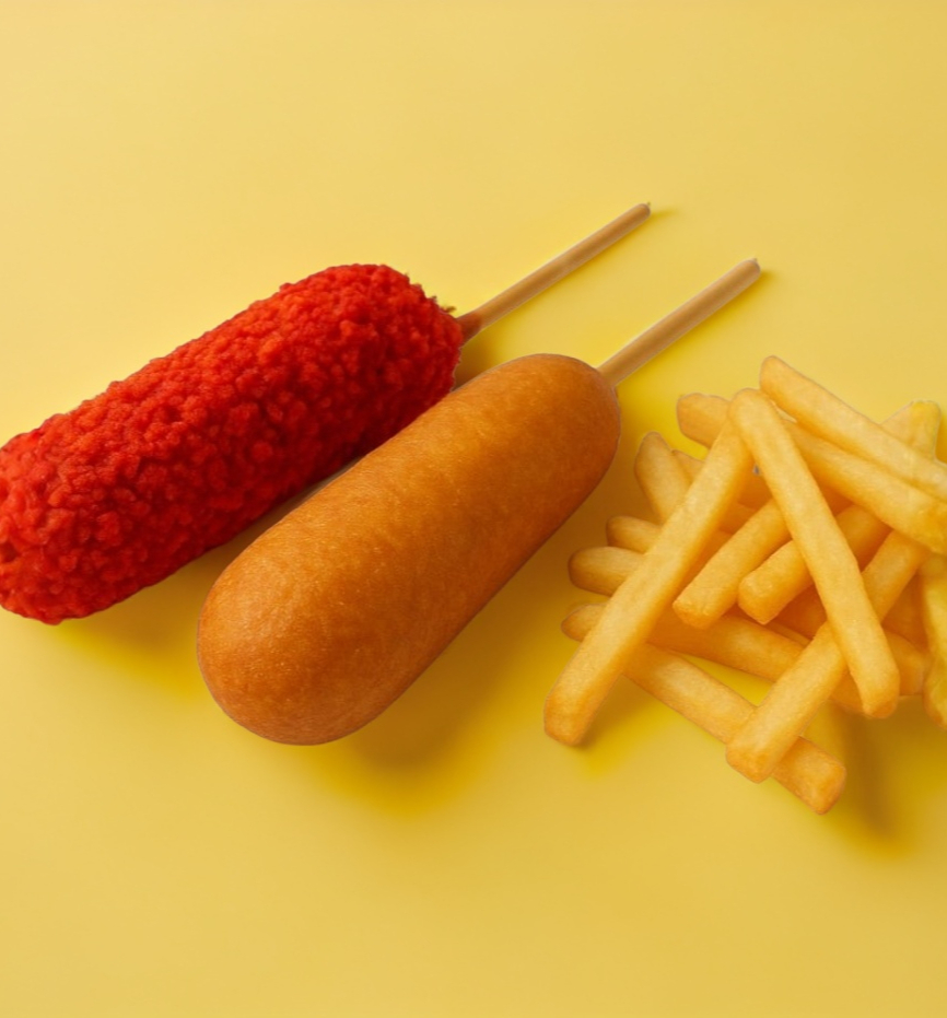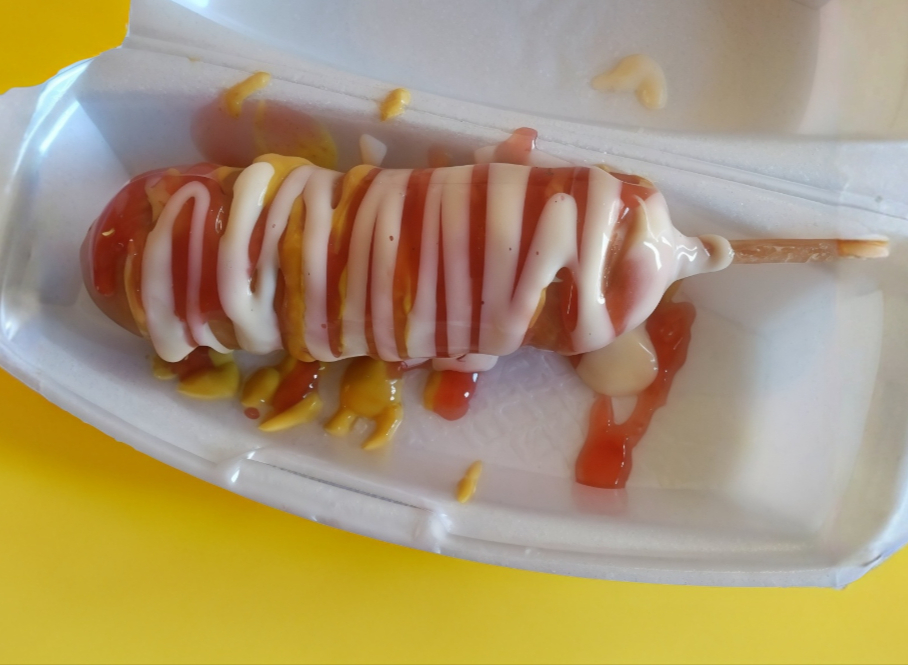 Salchicha empanizada, catsup, mayonesa, mostaza