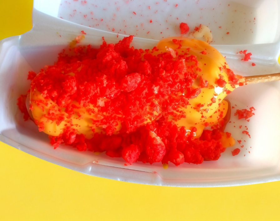 Salchicha empanizada, queso derretido amarillo, Cheetos fleming hot,, catsup, mostaza, mayonesa.