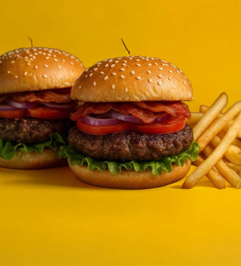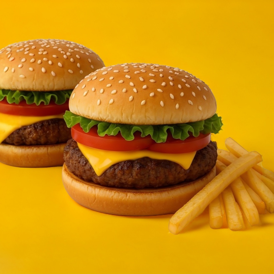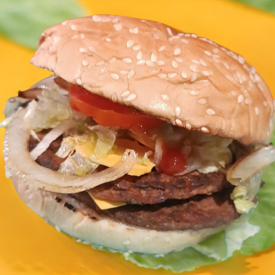 Pan de hamburguesa, doble carne de res, doble queso amarillo, lechuga, tomate, cebolla caramelizada, catsup, mostaza y mayonesa.