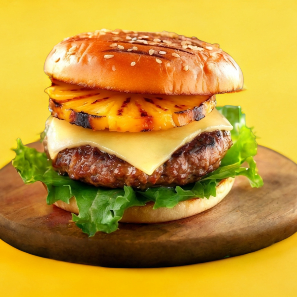 Carne de hamburguesa de sirloin, piña, queso amarillo, lechuga, tomate, mayonesa, catsup, mostaza, cebolla caramelizada,
