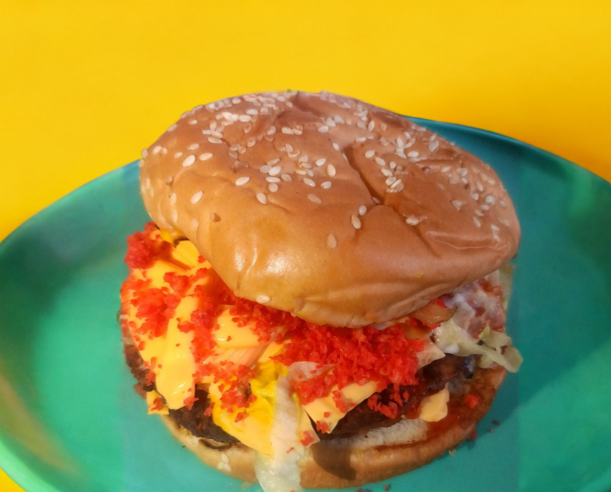 Pan para hamburguesa, carne de res, queso amarillo liquido, cebolla caramelizada y chetos flaming hot triturados