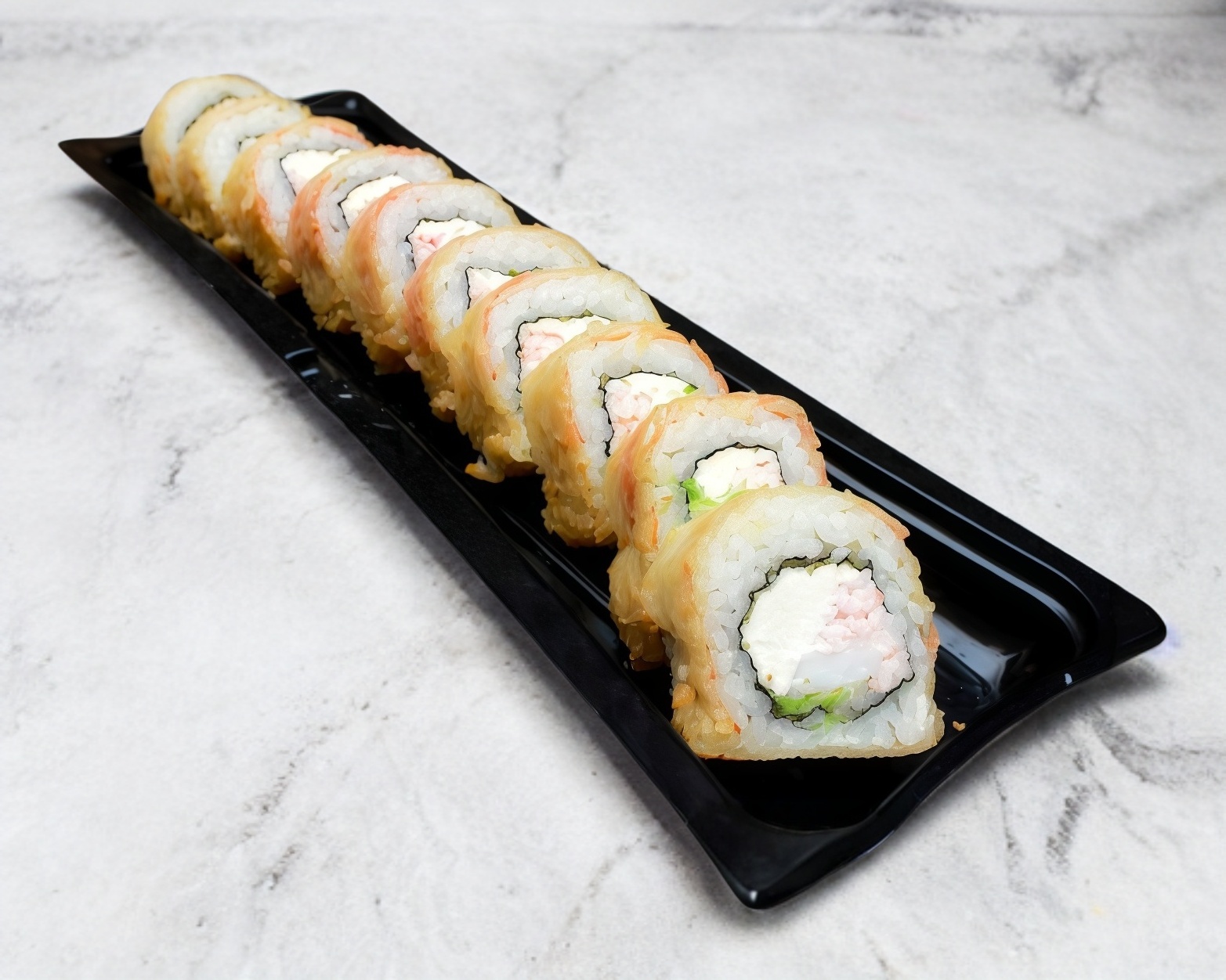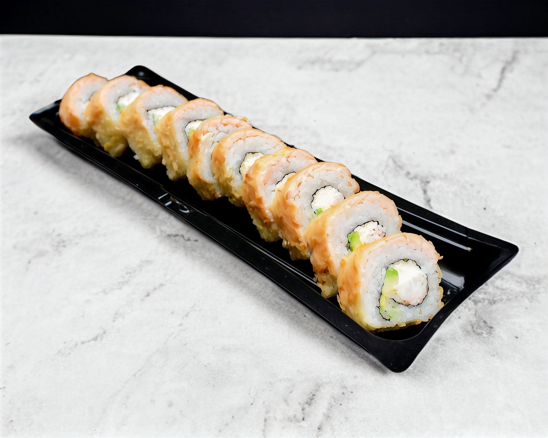 Philadelphia, aguacate, surimi, pepino y por fuera ajonjolí.