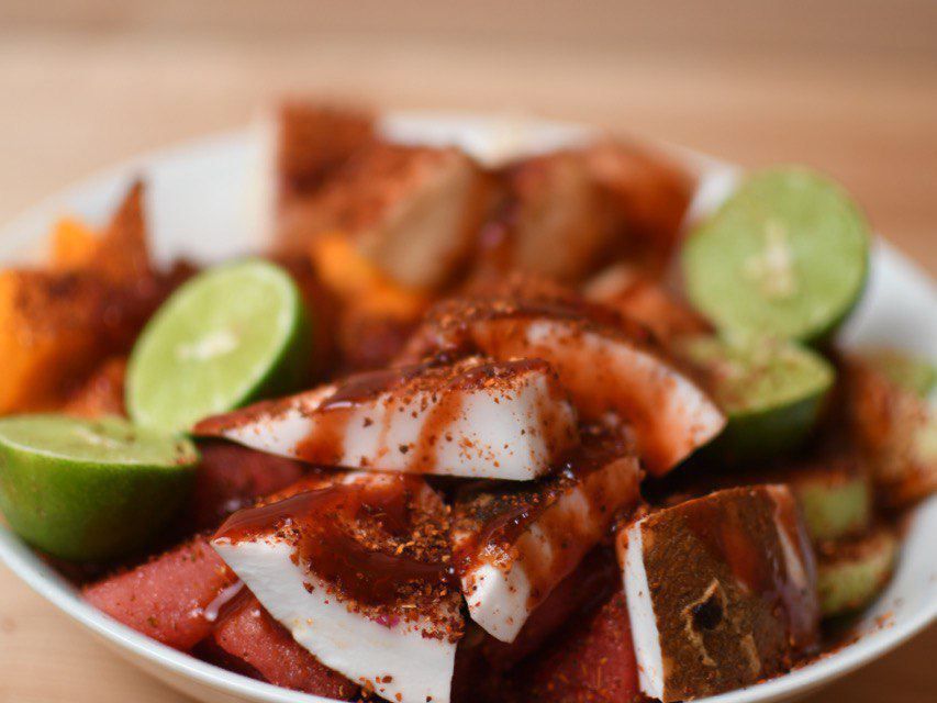 Frutas de temporada con Tajín,limón,chamoy y tico con toppings a escoger.