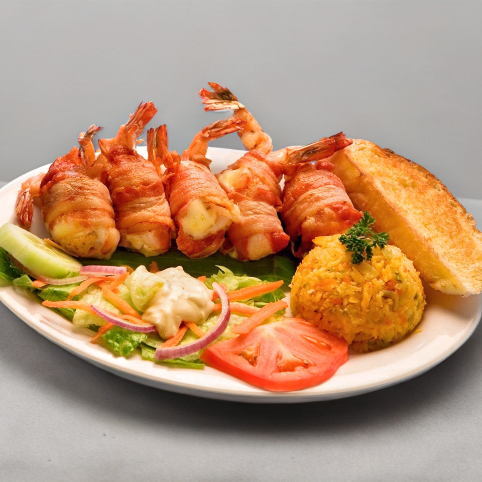 Camarón grande relleno de queso, envuelto en tocino, recomendado 100%. Acompañado de Pure, Arroz y Ensalada.