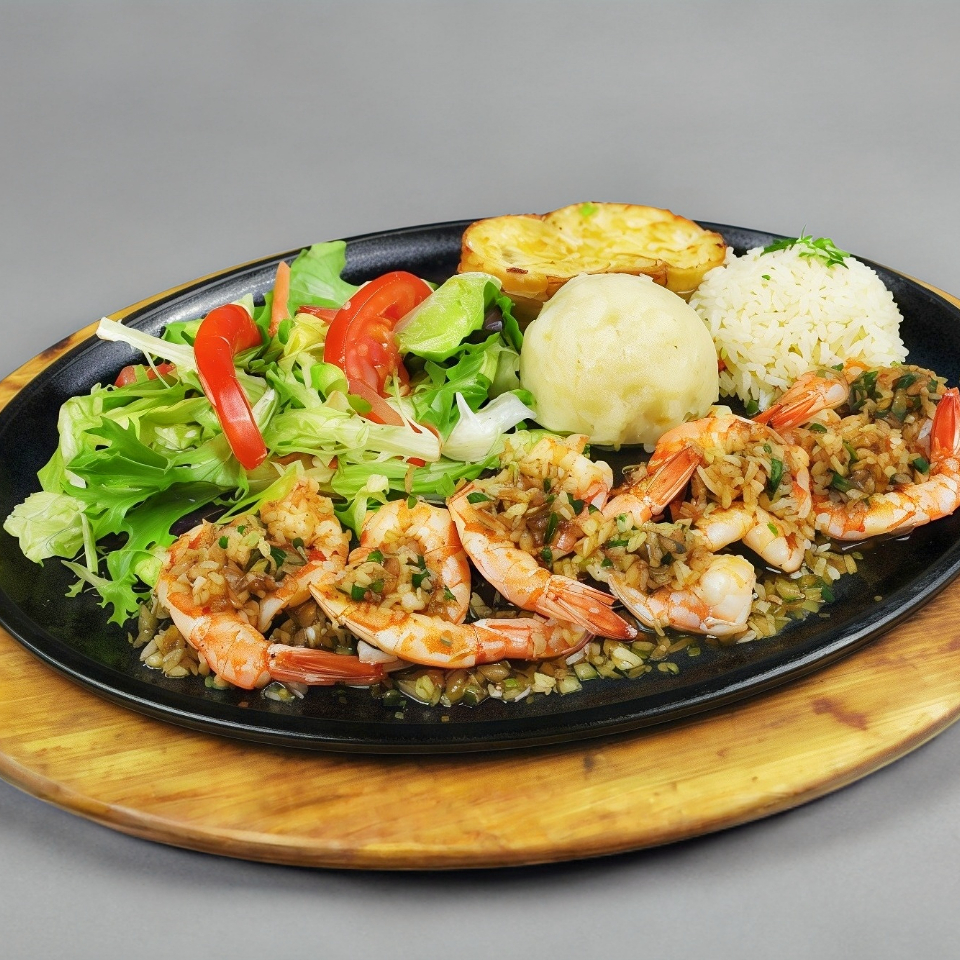 Camarones con ajo salteado, mantequilla y especias. Acompañado de Pure, Arroz y Ensalada.