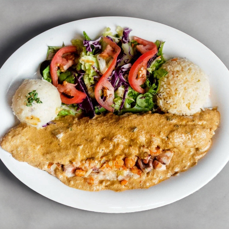 Filete de pescado relleno con Camarón, pulpo, queso y especias, bañado en crema de champiñón. Acompañado de Pure, Arroz y Ensalada.