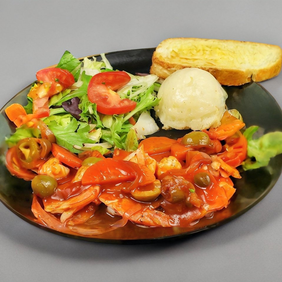 Sazonado con alcaparras, aceituna, zanahoria, cebolla, tomate y chiles. Acompañado de Pure, Arroz y Ensalada.
