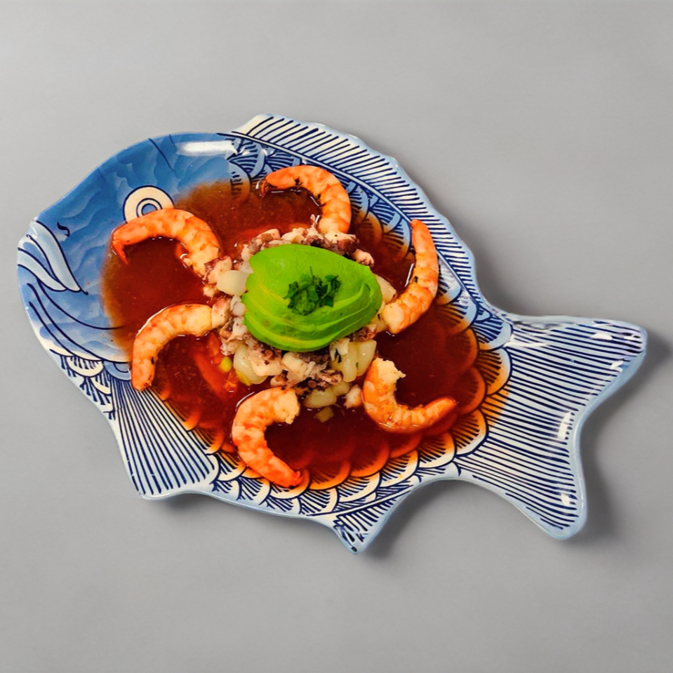 Camarón Crudo, pulpo cocido, camarón cocido y callo de hacha bañado en salsa especial con limón, especies, cebolla morada y pepino