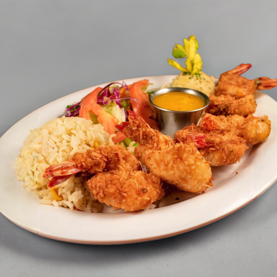 Camarones empanizados en coco con salsa agridulce o mango. Acompañado de Pure, Arroz y Ensalada.