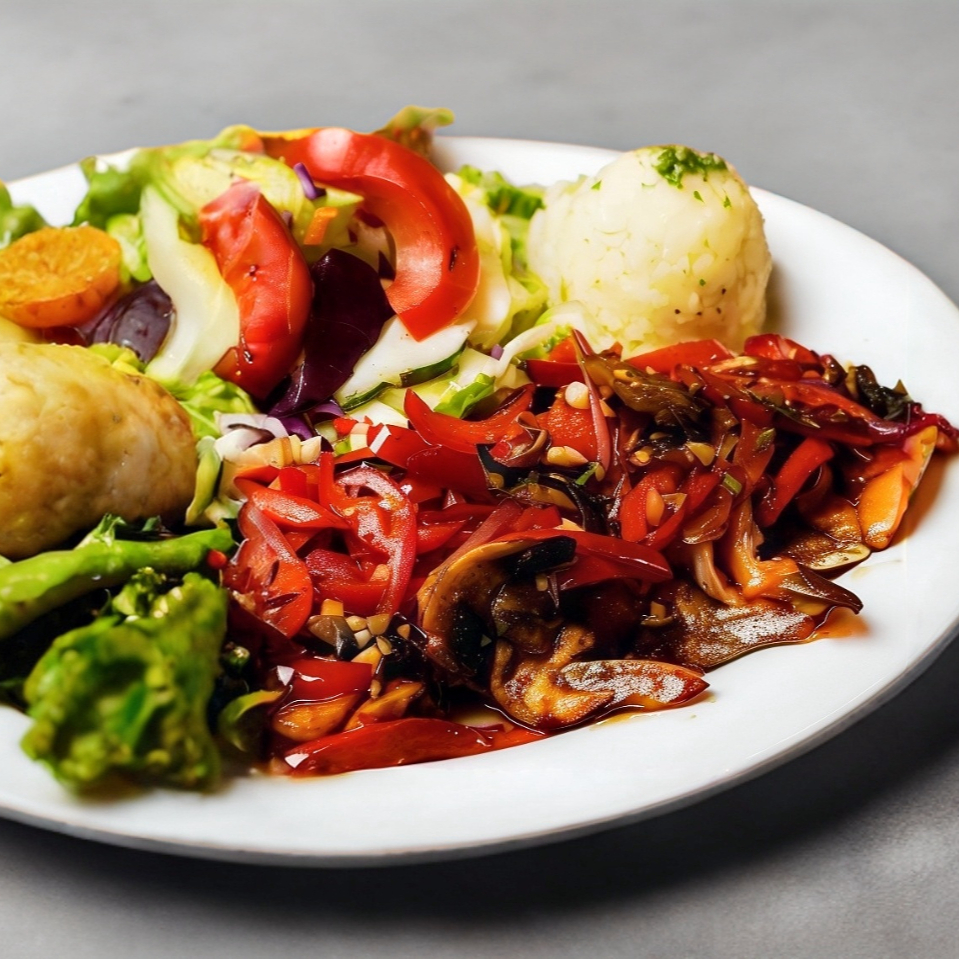 Cubierto de champiñon, morron rojo, cebolla,chiles y especias. Acompañado de Pure, Arroz y Ensalada.