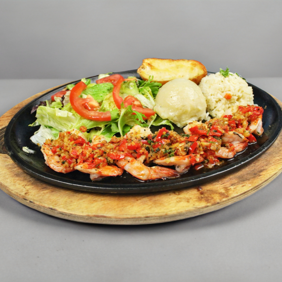 Camarones a la Plancha cubiertos de chile morrón, zanahoria, salteados en salsa de ostion y piña asada. Acompañado de Pure, Arroz y Ensalada.