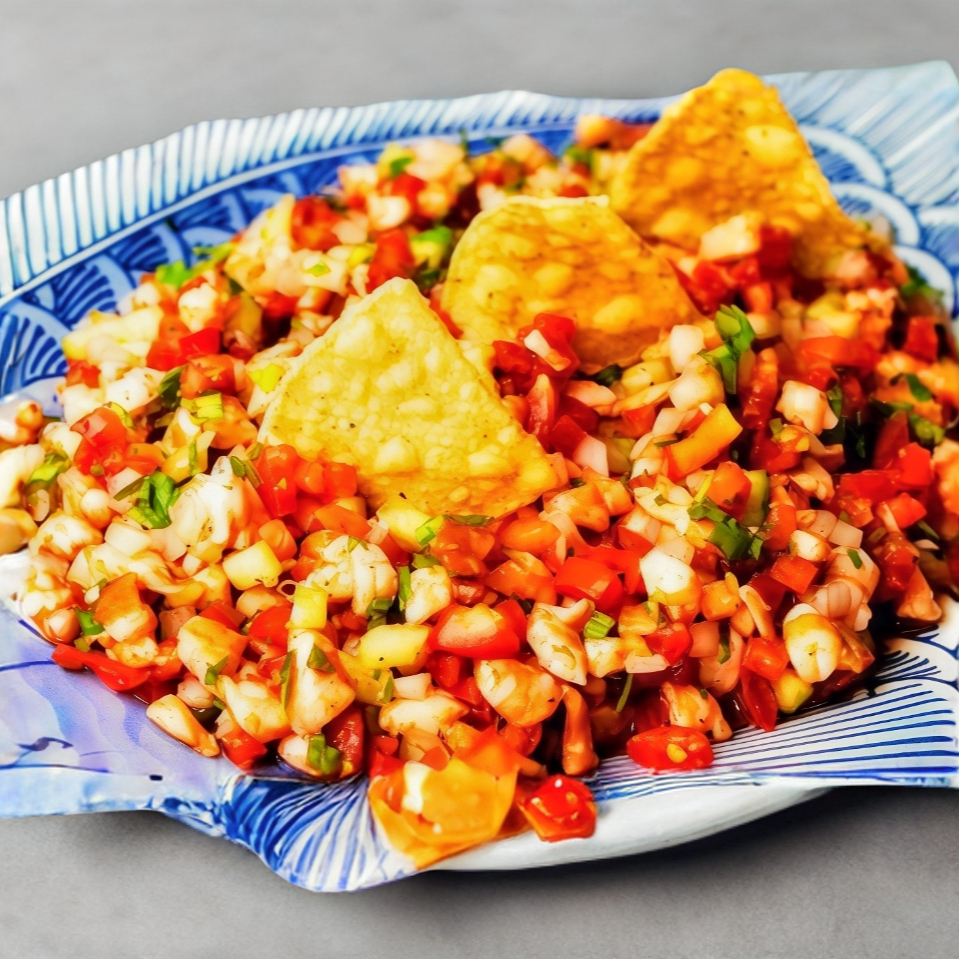 Camaron, callo de hacha, pulpo, aguacate, con pepino, cebolla, tomate en una deliciosa salsa de la casa