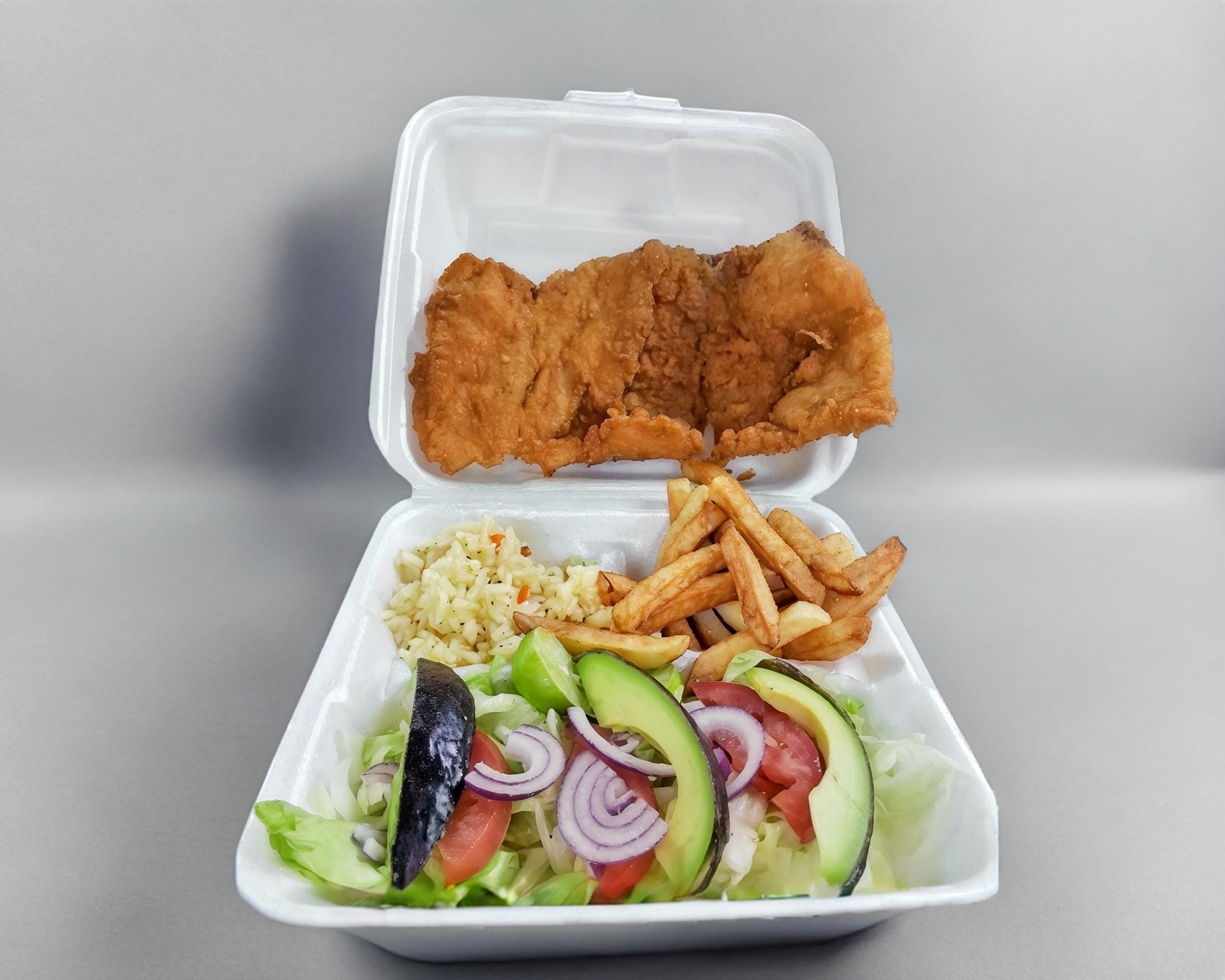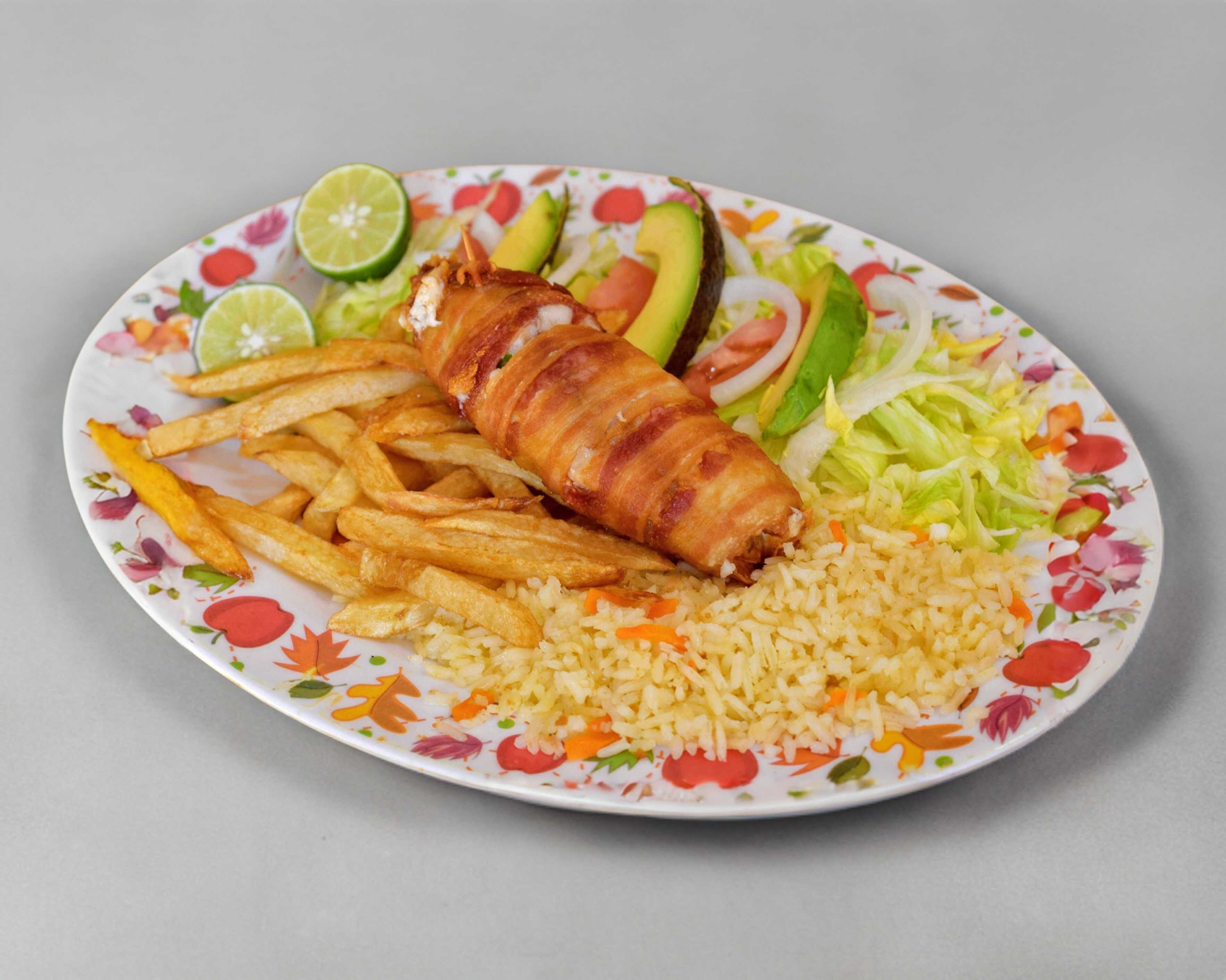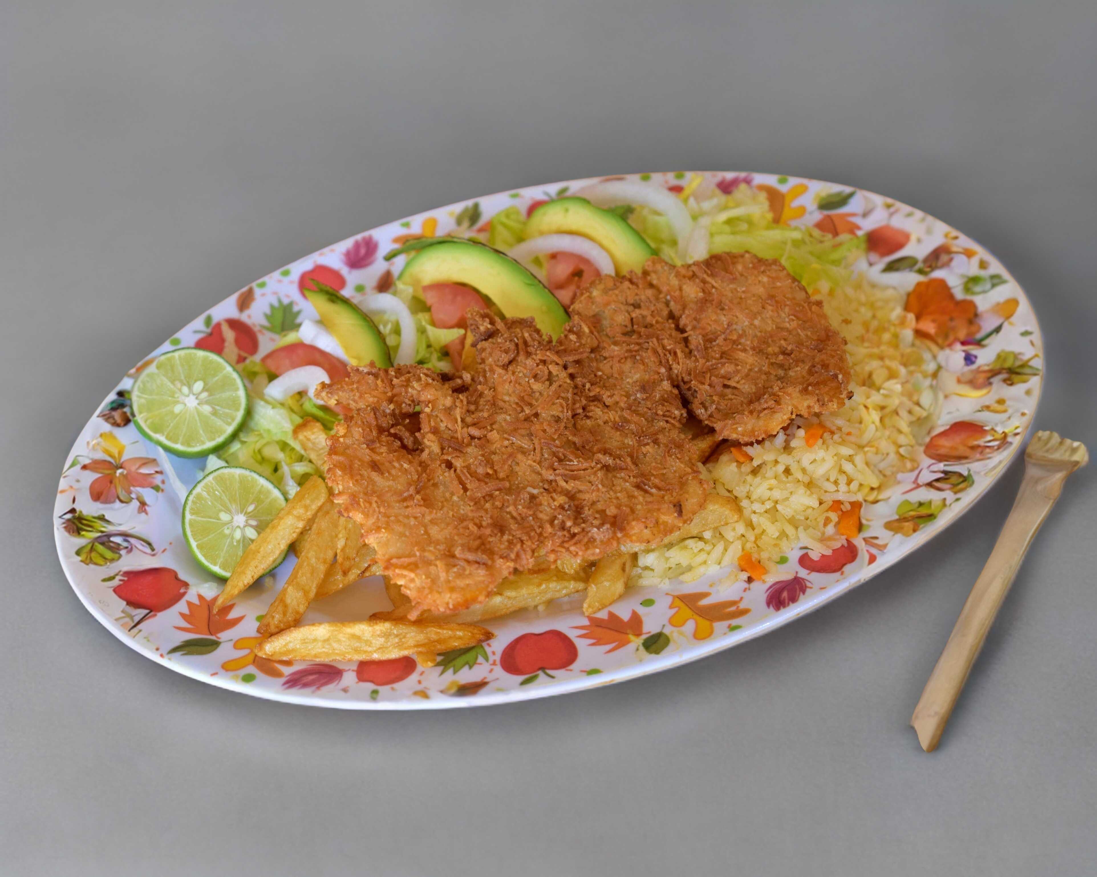 Filete empanizado con verdura, arroz papas a la francesa, totopos galletas aguacate, cebolla, tomate limon y pico ce gallo