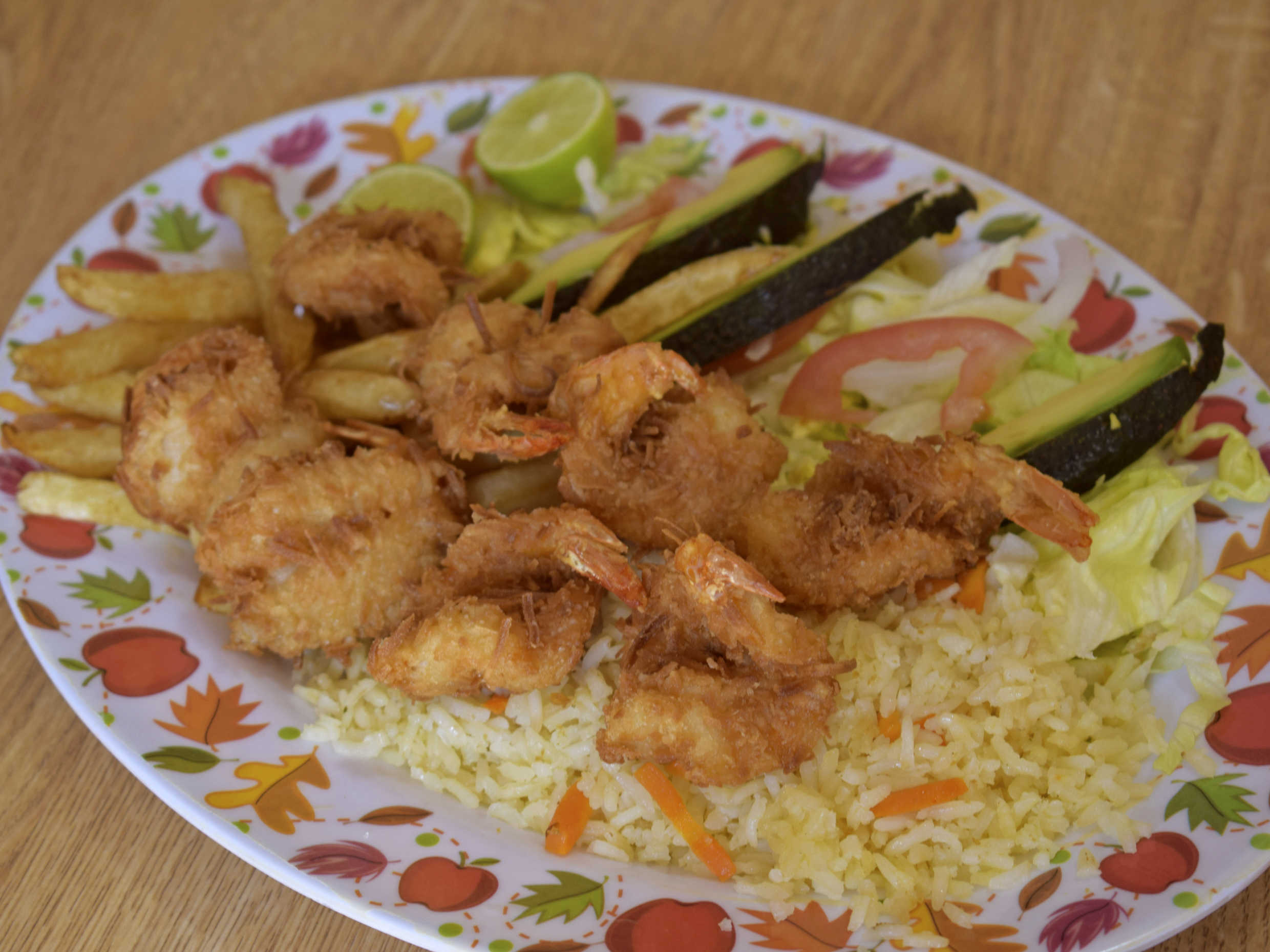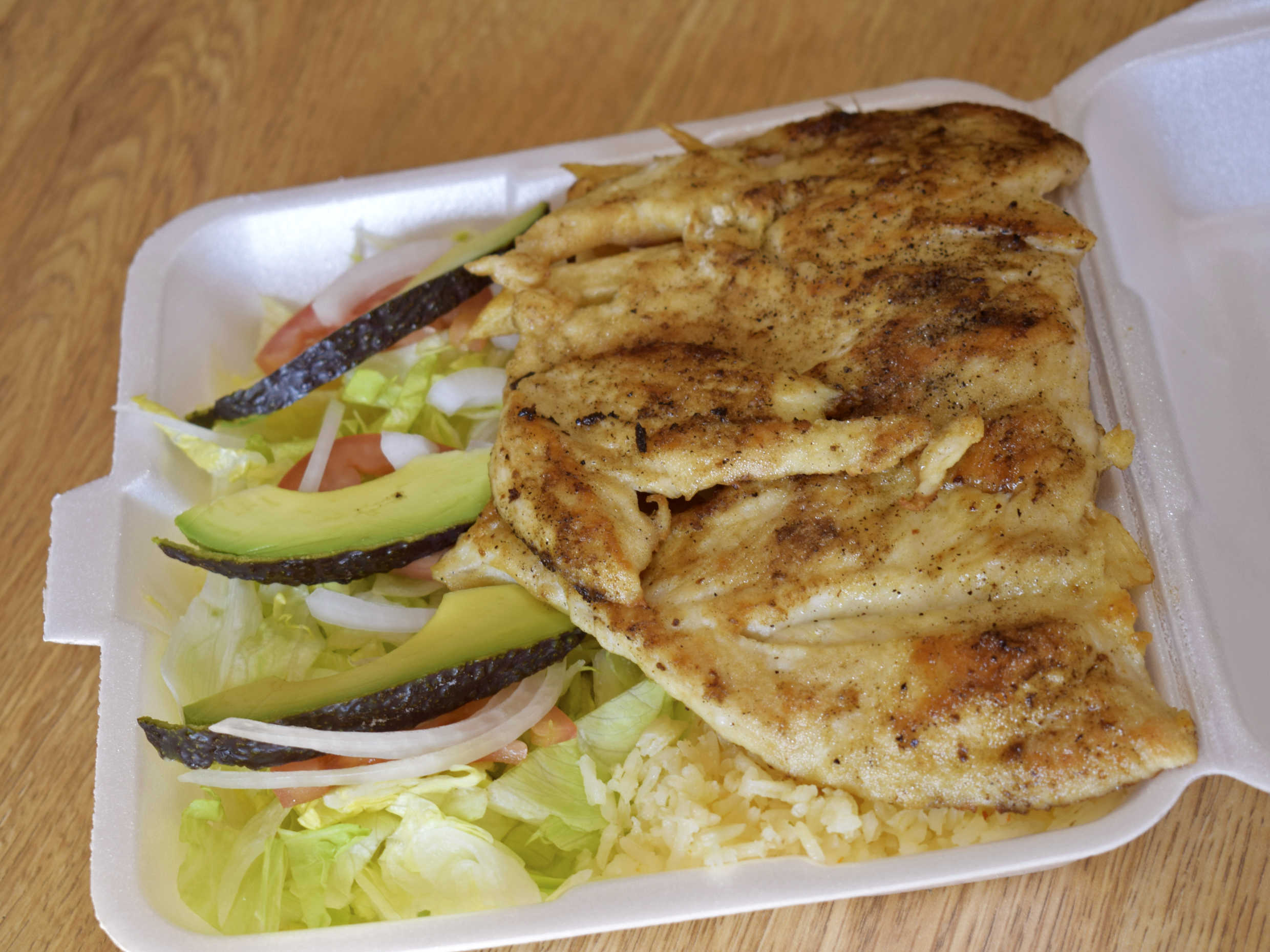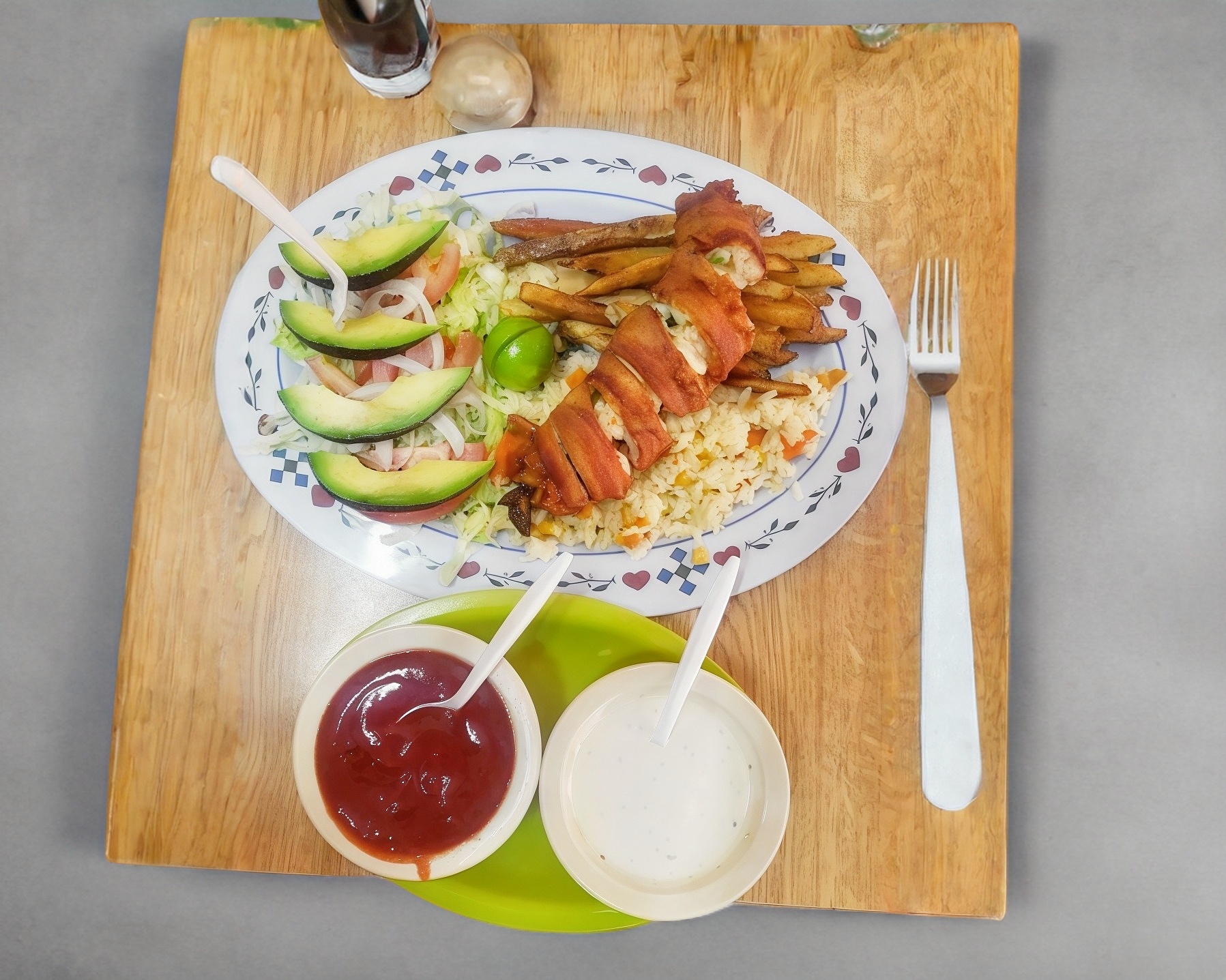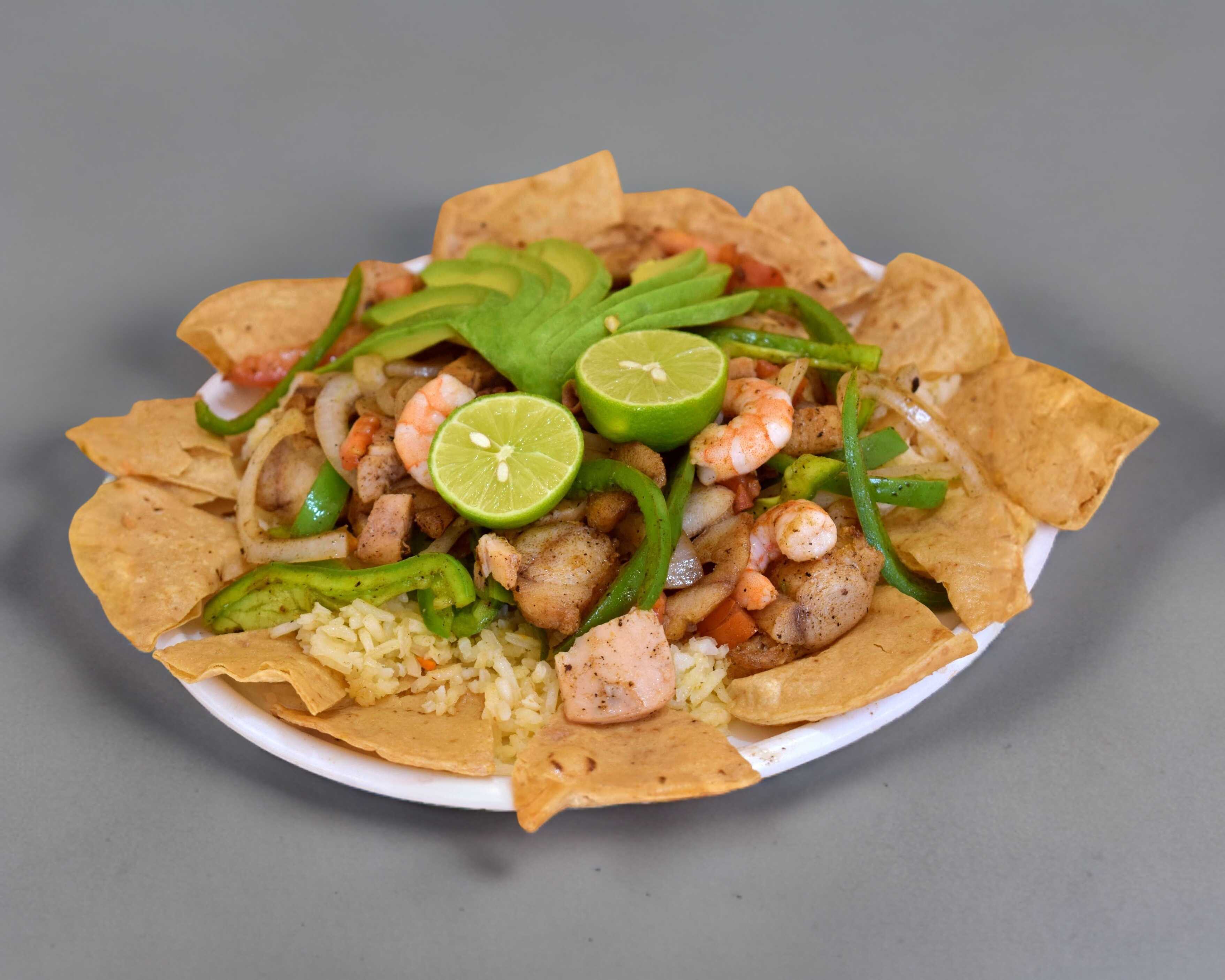 Filete empanizado con verdura, arroz papas a la francesa, totopos galletas aguacate, cebolla, tomate limon y pico ce gallo