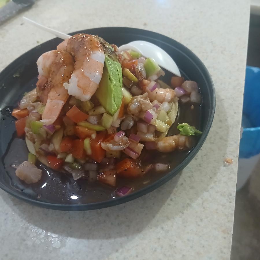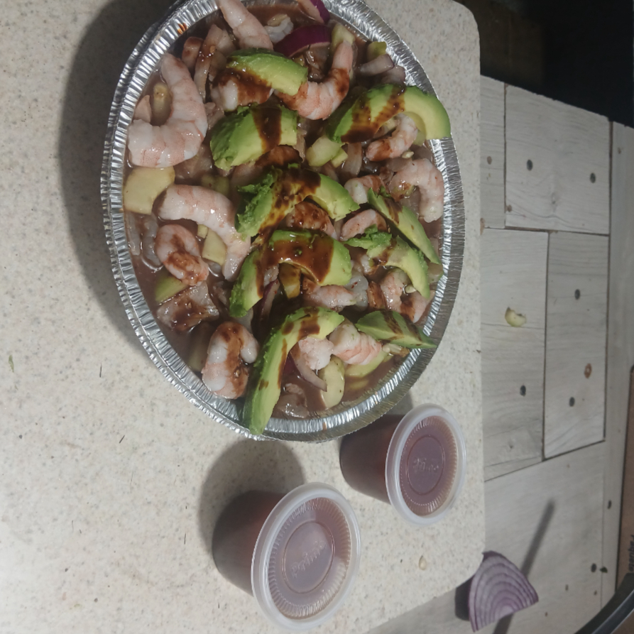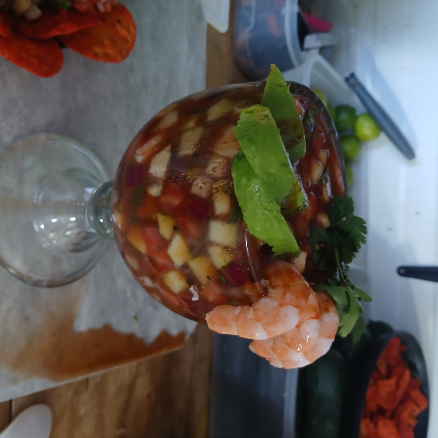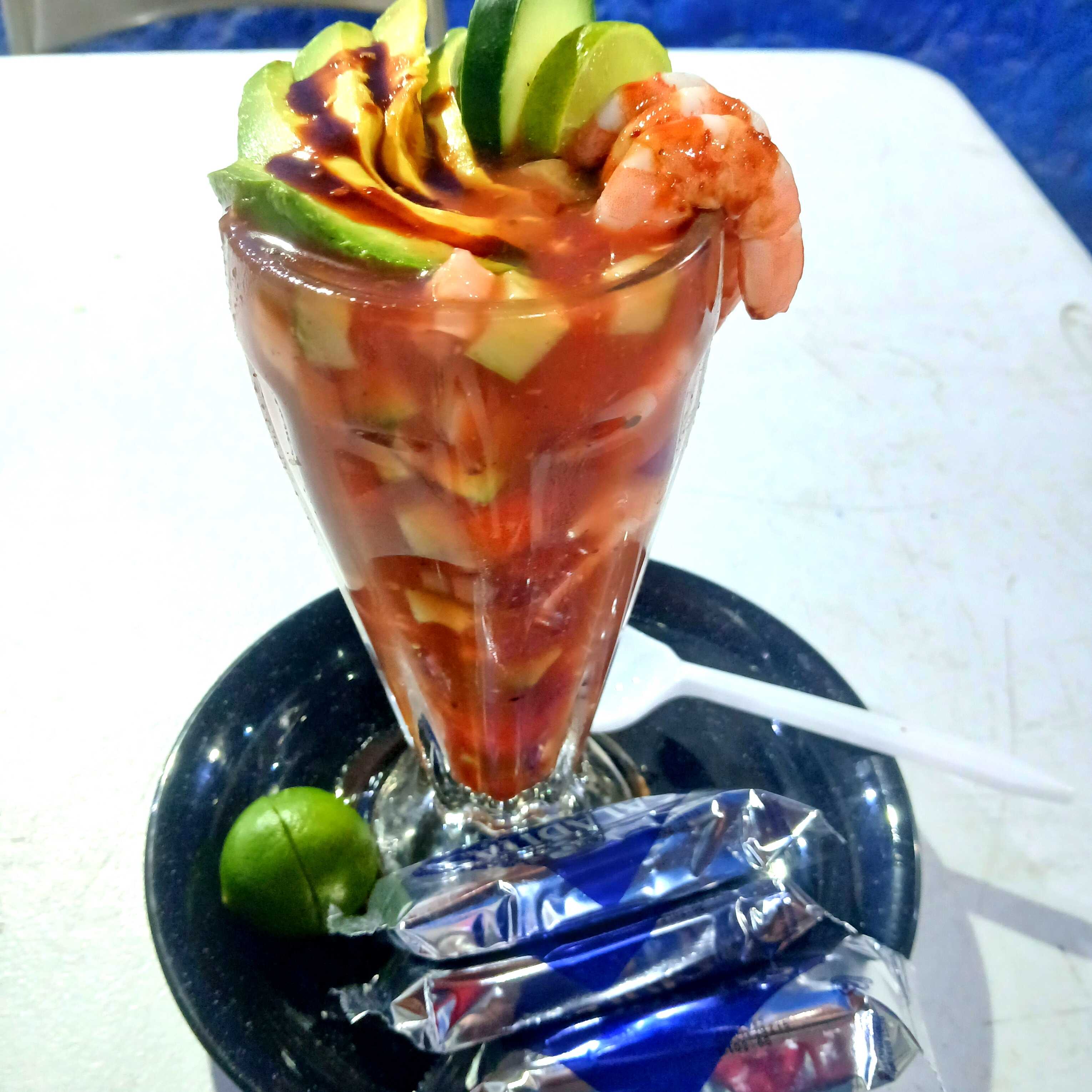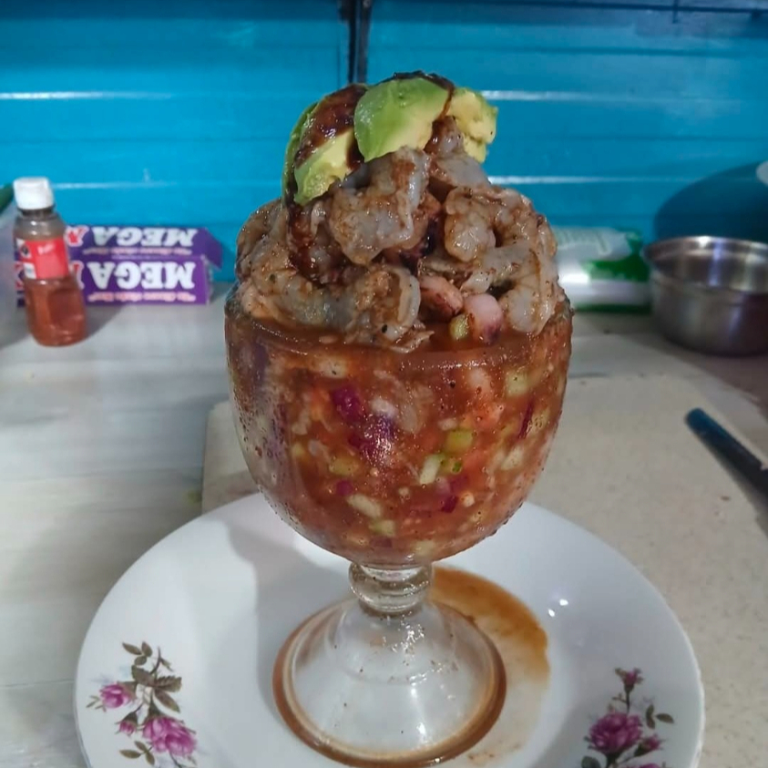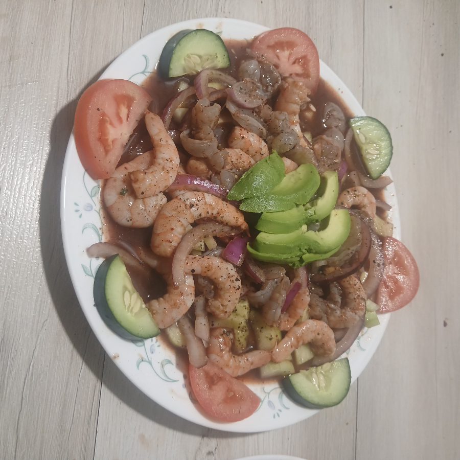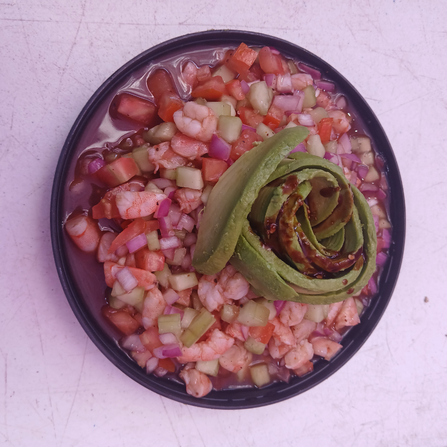 Camarón, pepino, cebolla, tomate, aguacate y salsa especial de la casa.