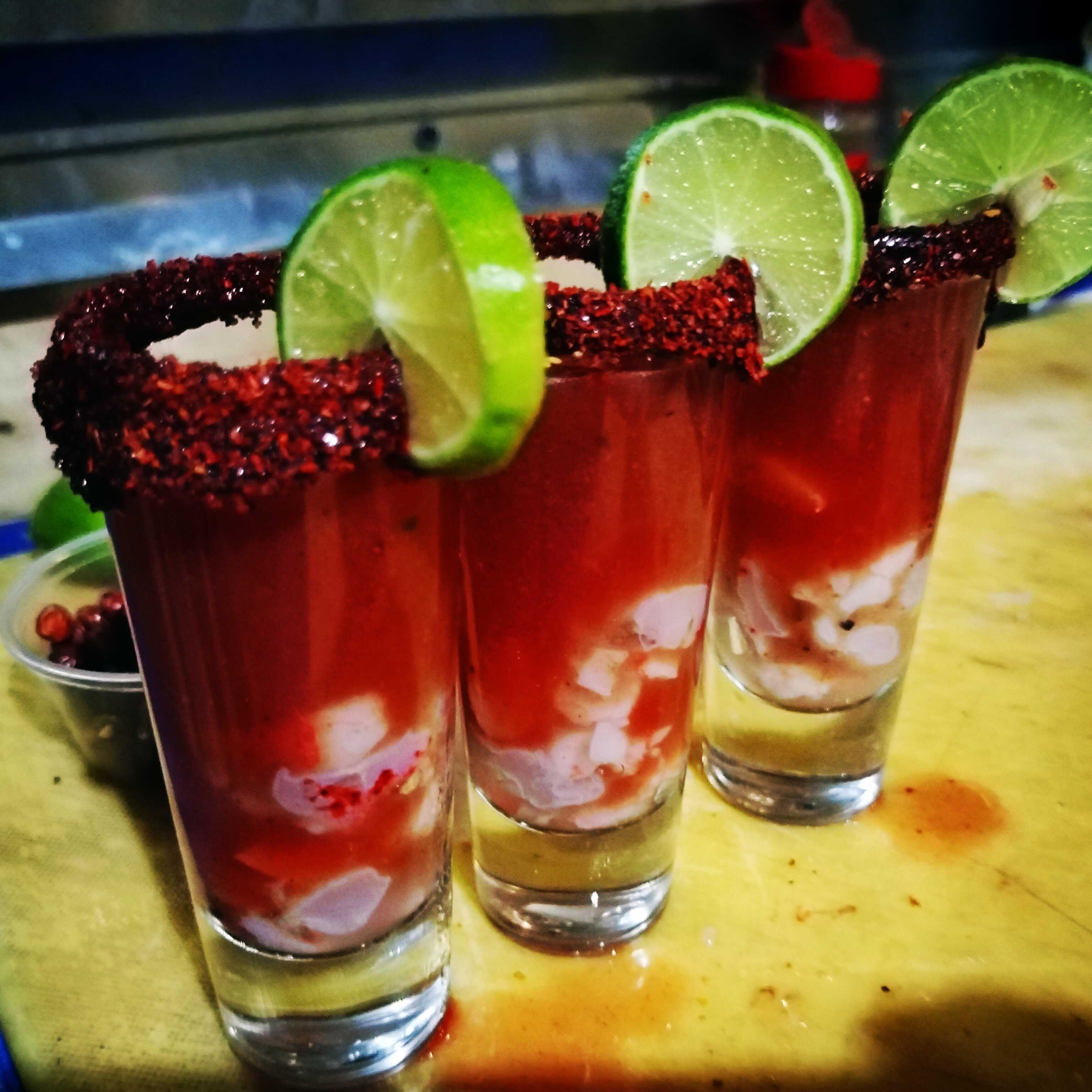 Shot escarchado de ostión o camarón, clamato, caldo de camarón y salsa especial de la casa.
