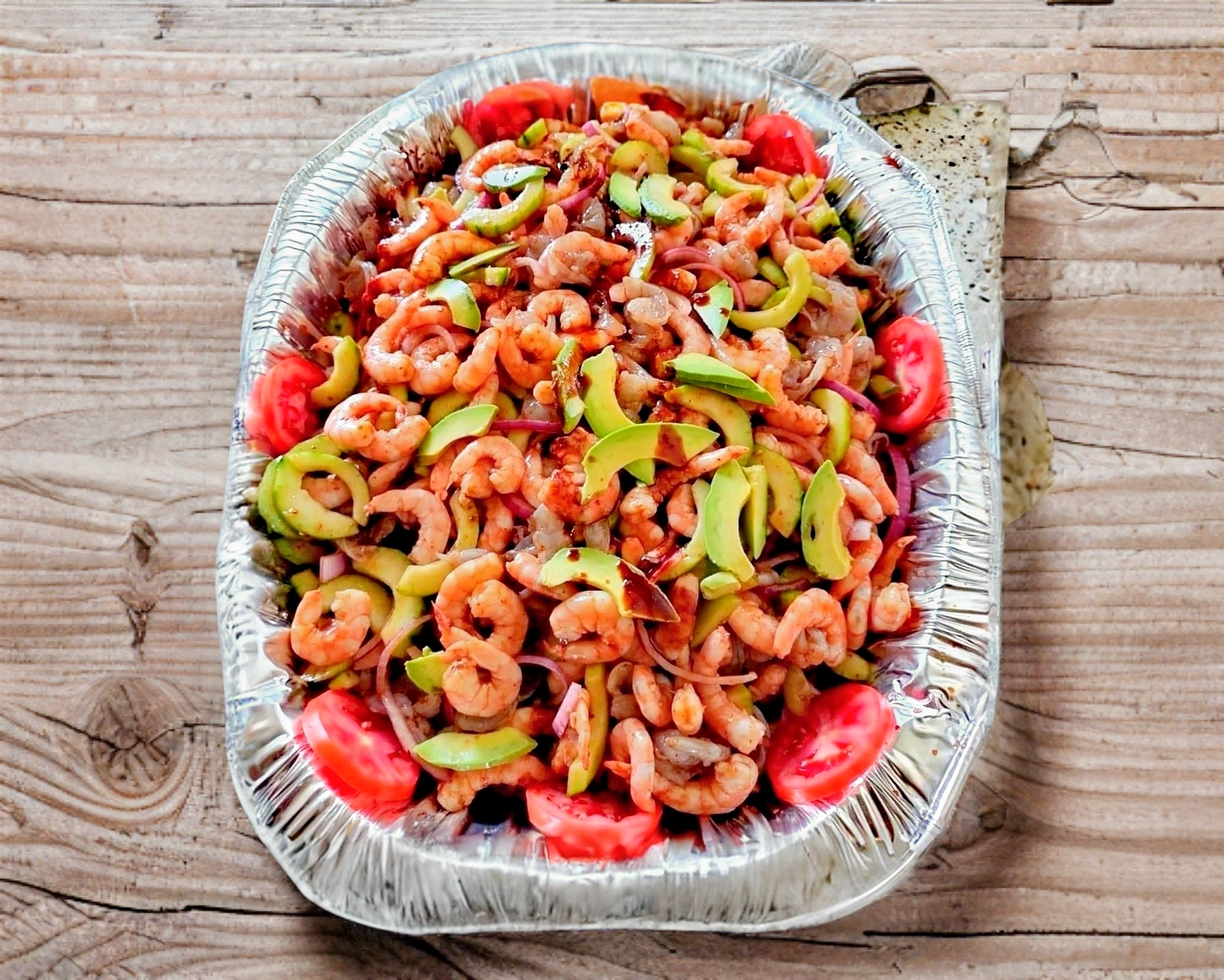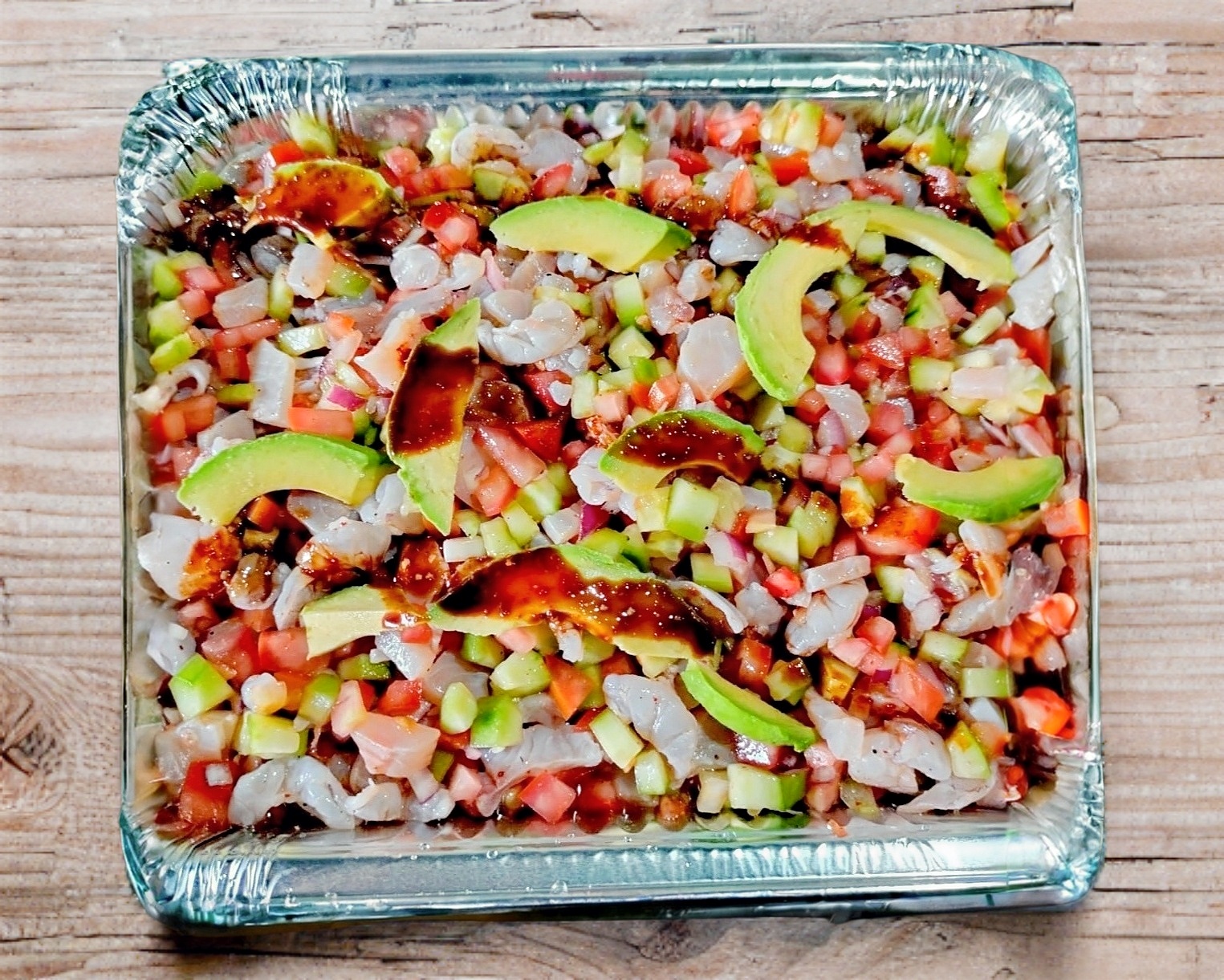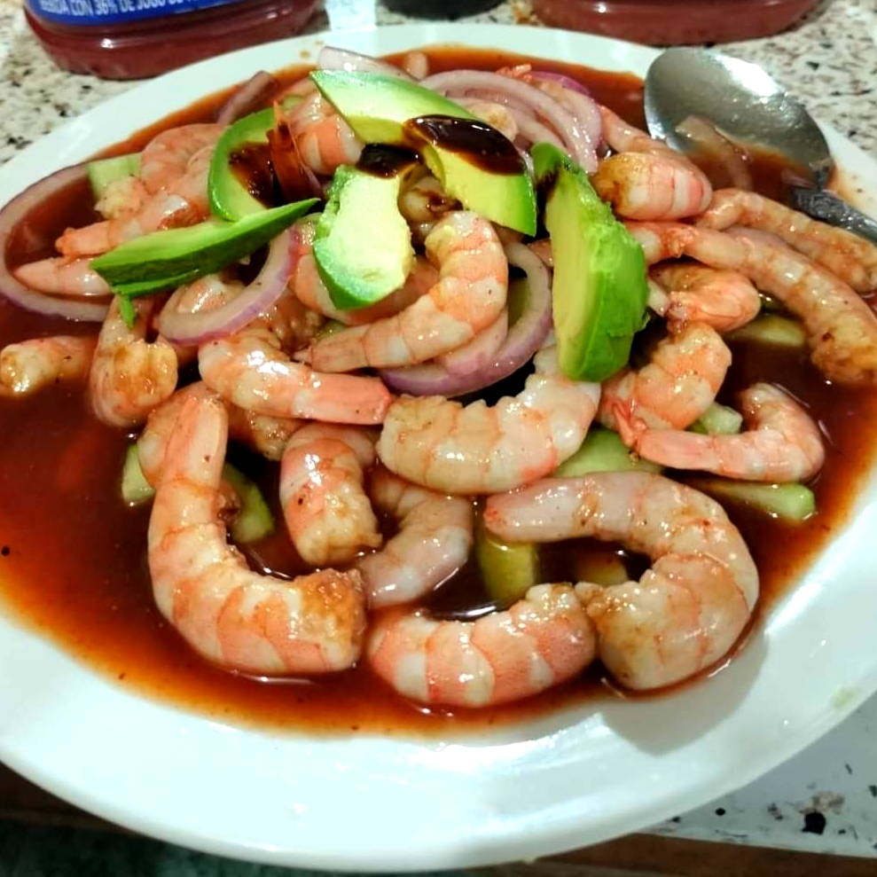 Preparado con nuestra salsa especial de la casa,camaron cocido, cebolla morada, tomate, pepino y aguacate. (1 Litro).