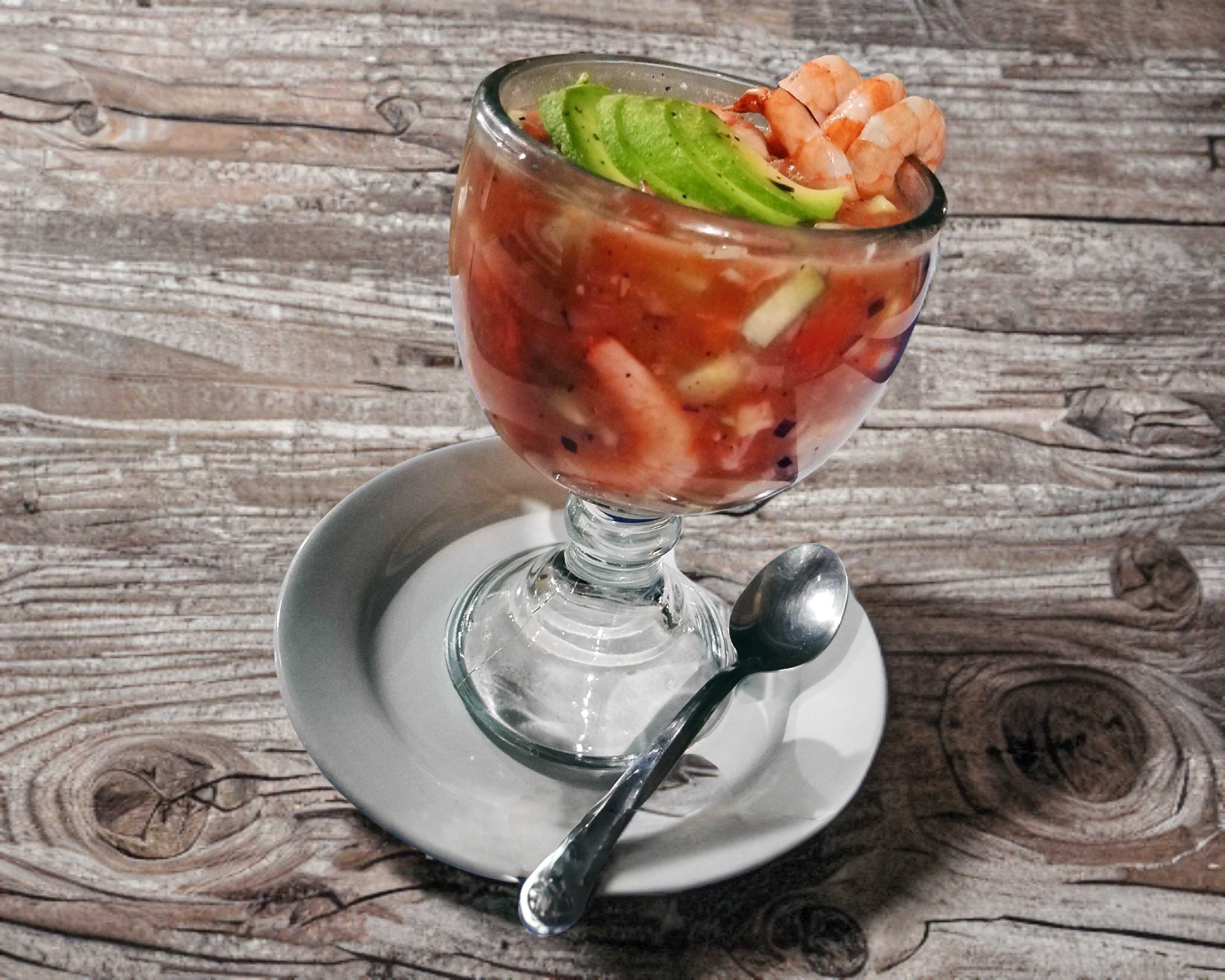 Camarón, pepino, cebolla, tomate, aguacate y salsa especial de la casa.