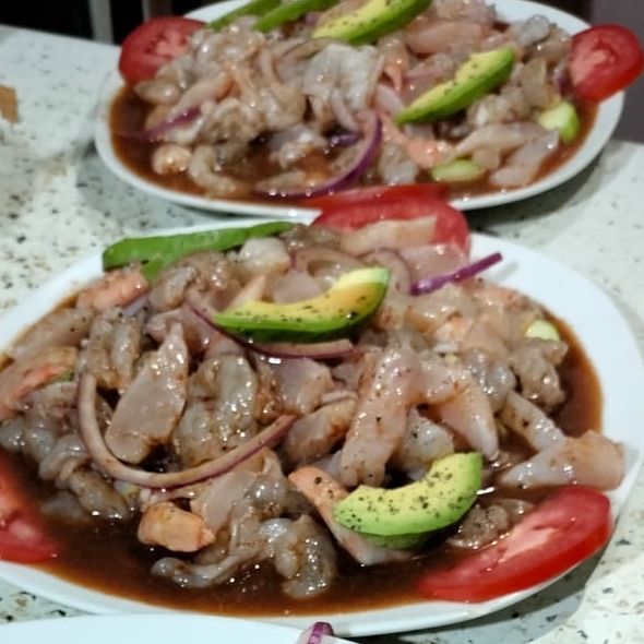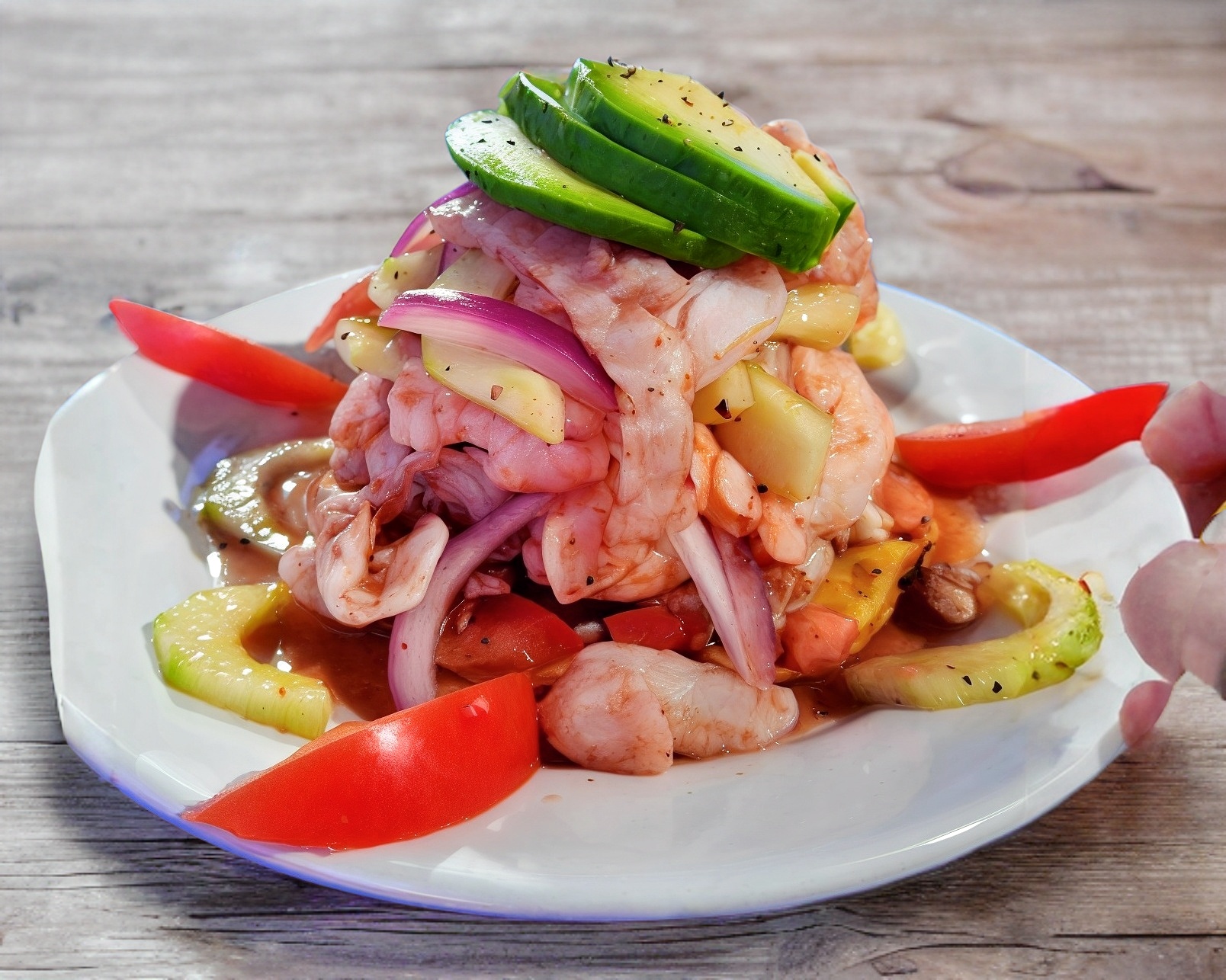 Ceviche, camarón cocido, crudo, callo, aguachiles, aguacate y salsa especial de la casa.