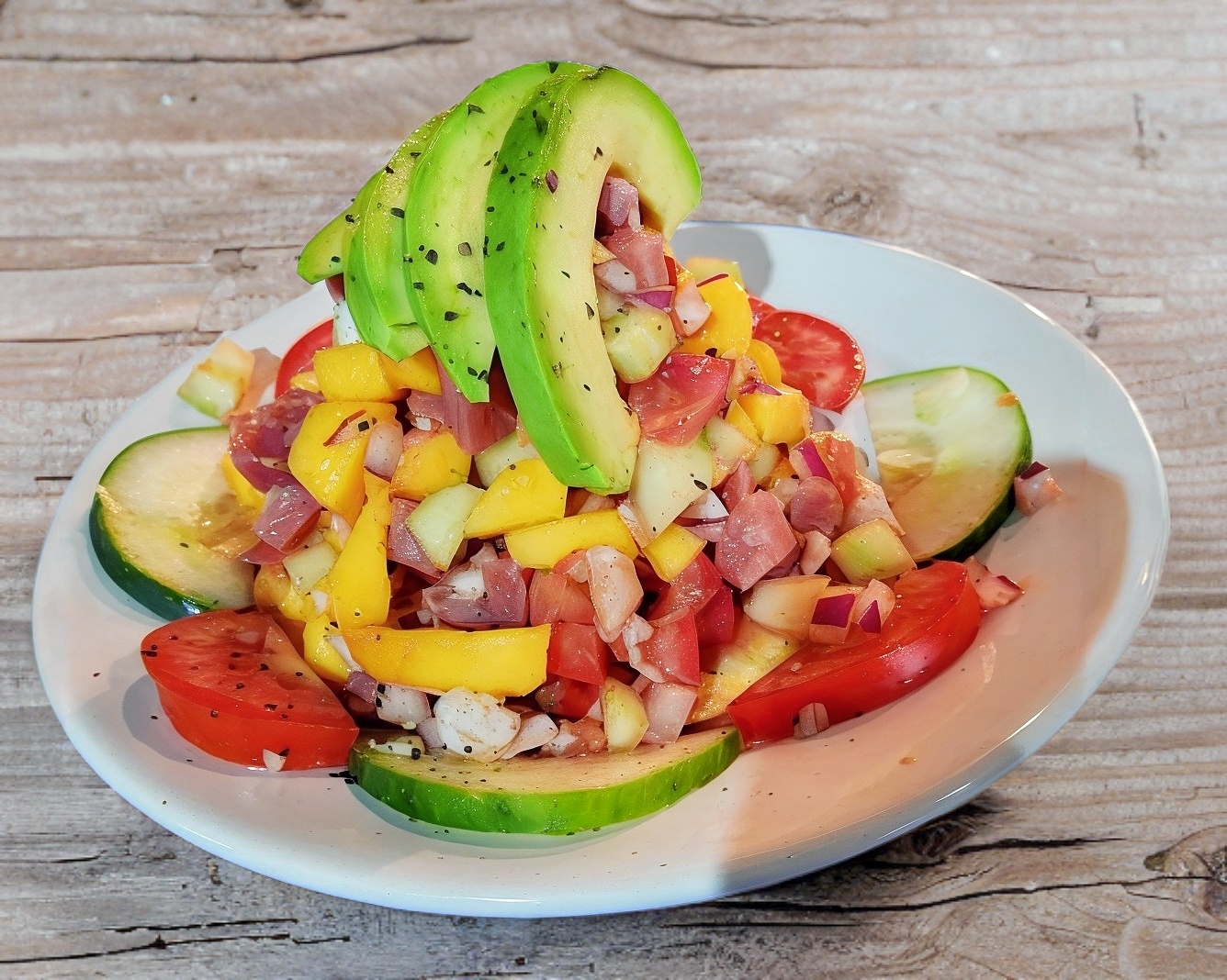 Camarón cocido, crudo y medallon de atún, pepino, cebolla morada, tomate, aguacate, salsa especial de la casa y mango.
