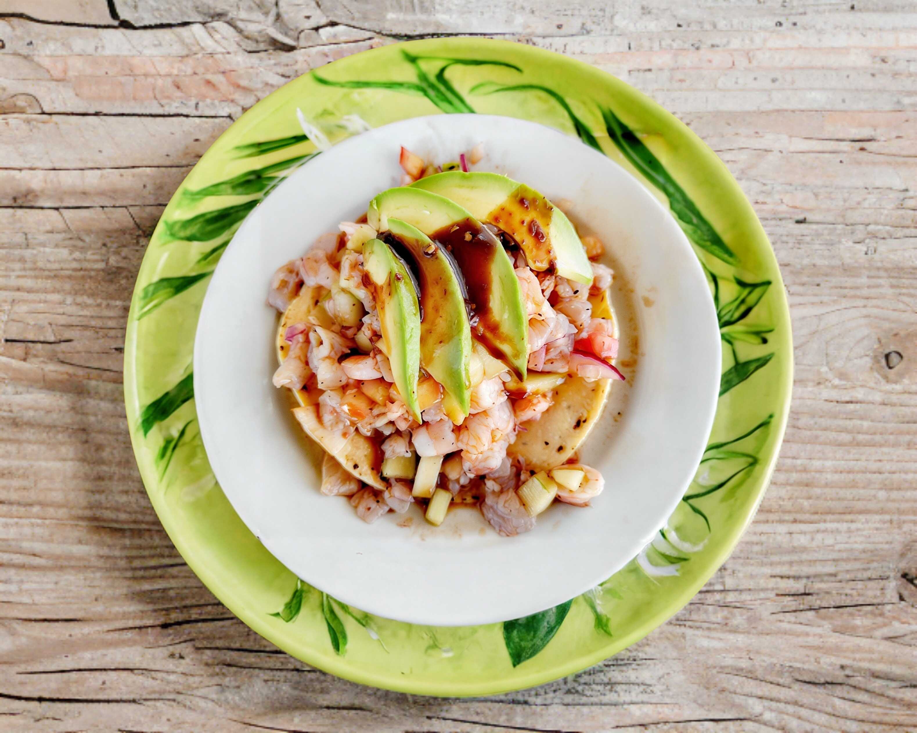 Ceviche de camarón, camarón cocido, crudo, callo, aguachiles, aguacate y salsa especial de la casa. Bien servido sobre una tostada.