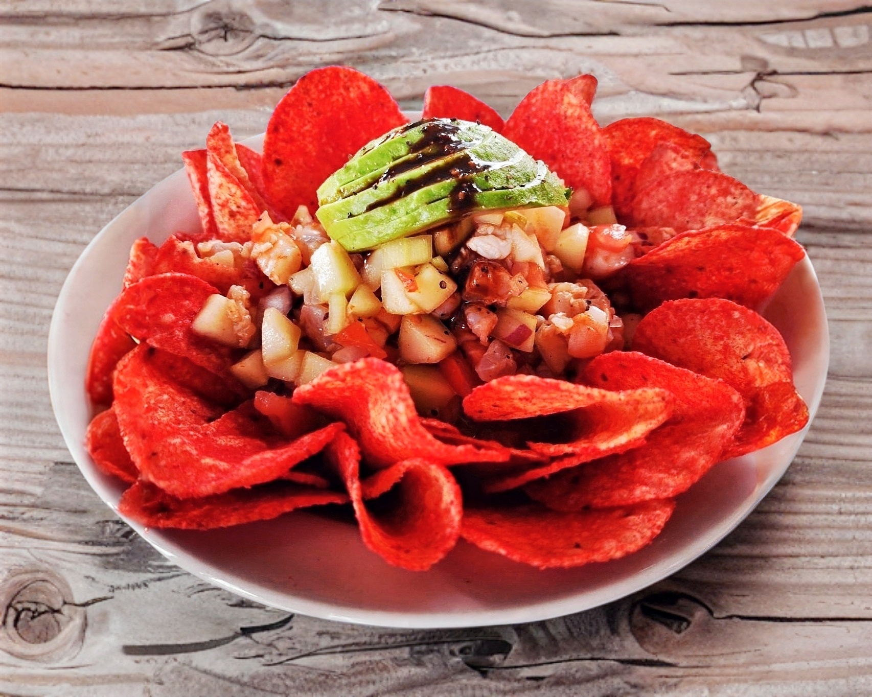 Ceviche de camarón o mixto (con camarón y callo), pepino, cebolla morada, tomate, aguacate y salsa especial de la casa. Bien servidos con tostitos morados o verdes.
