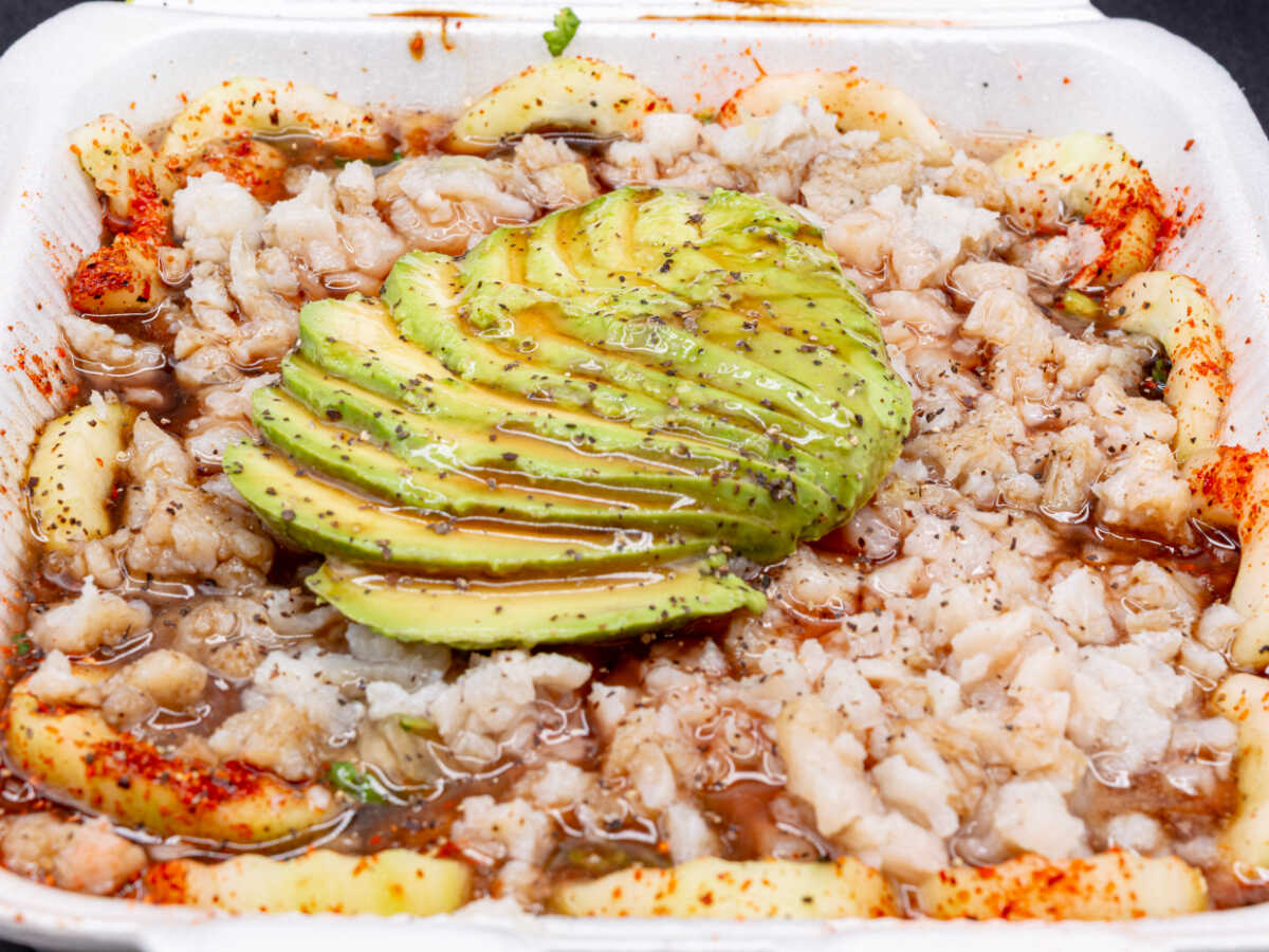 Ceviche de camarón, ceviche de pescado, ceviche de surimi, ceviche de calamar, dos ostion en concha, aguachiles, Clamato aguacate , limon, soya, sal, tostadas, galletas, salsa aparte