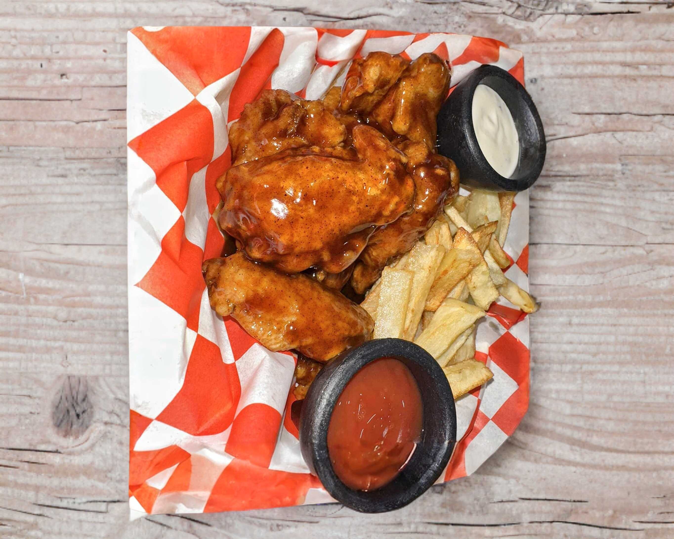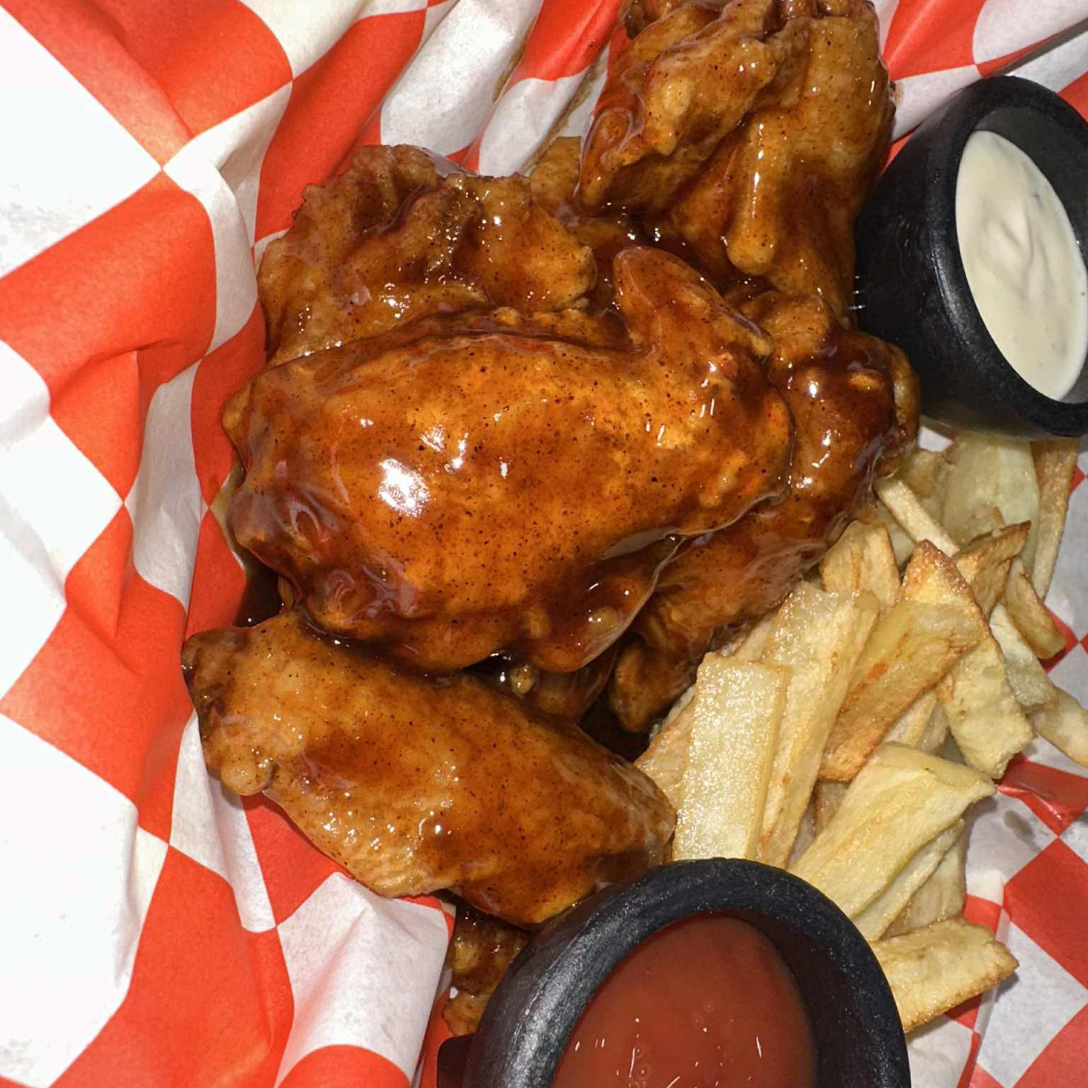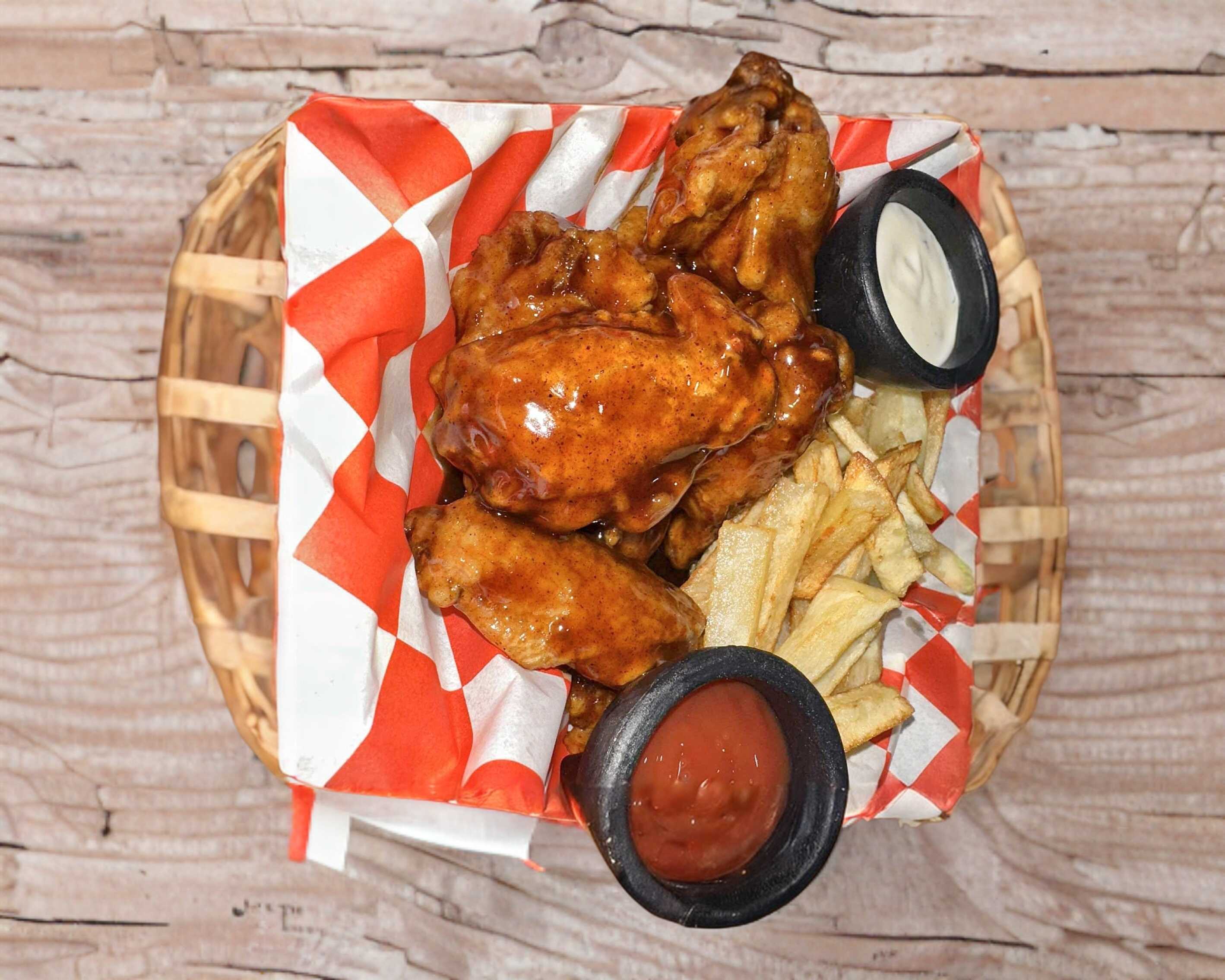 Alitas, papas, aderezo, catsup